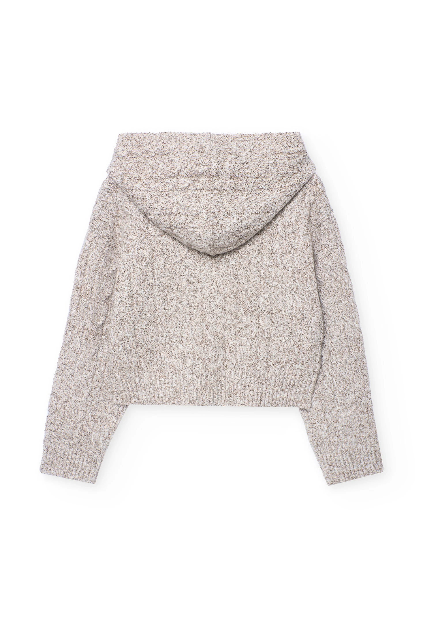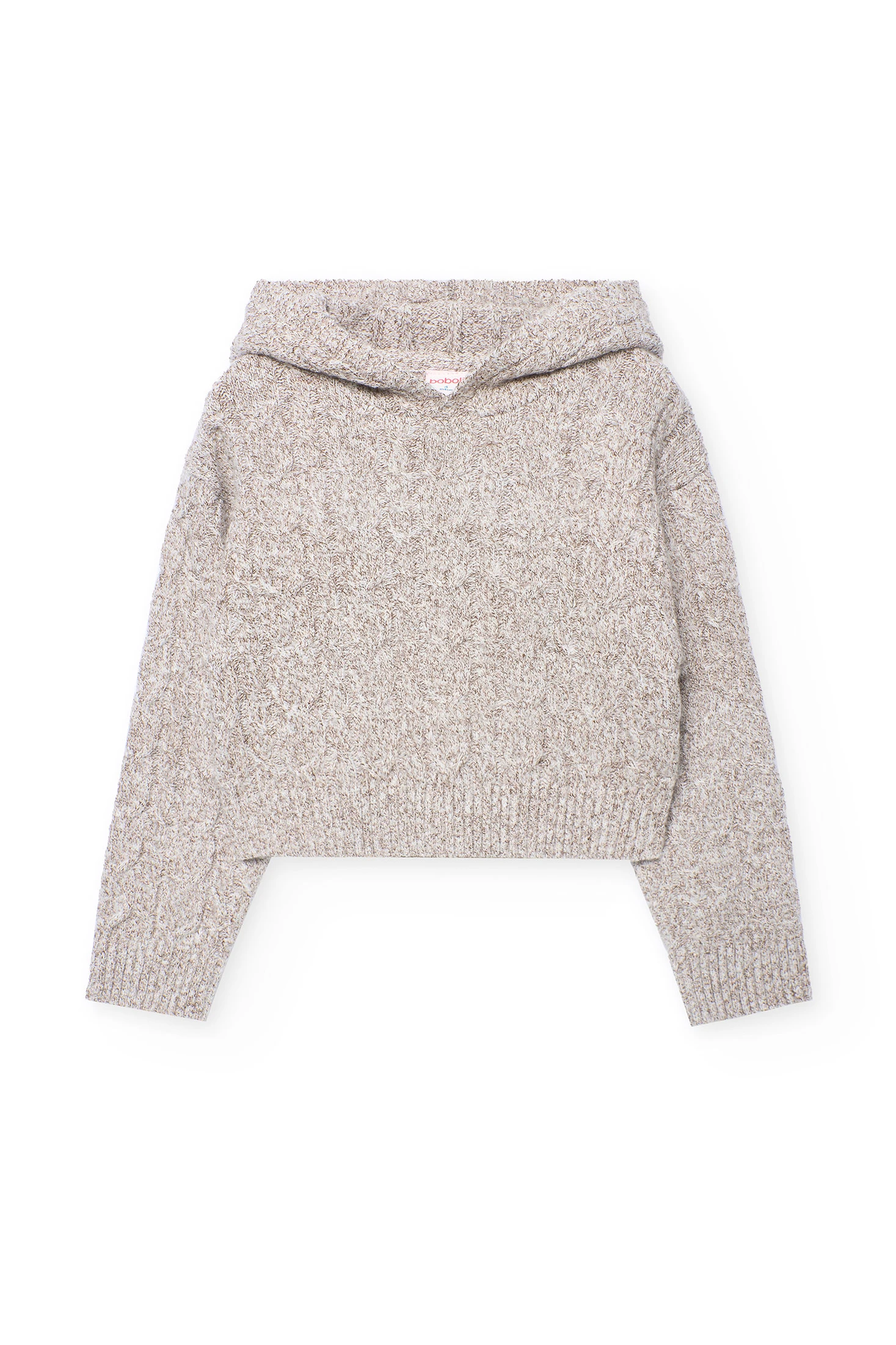Knitted jumper for girls in brown, with a hood. It offers warmth and comfort, perfect for keeping little ones cosy during cold days. Crafted in soft knit, it easily pairs with trousers or skirts, creating a versatile and cheerful look. Available in sizes from 2 to 14 years, this design is a practical and stylish choice for any children's wardrobe.
