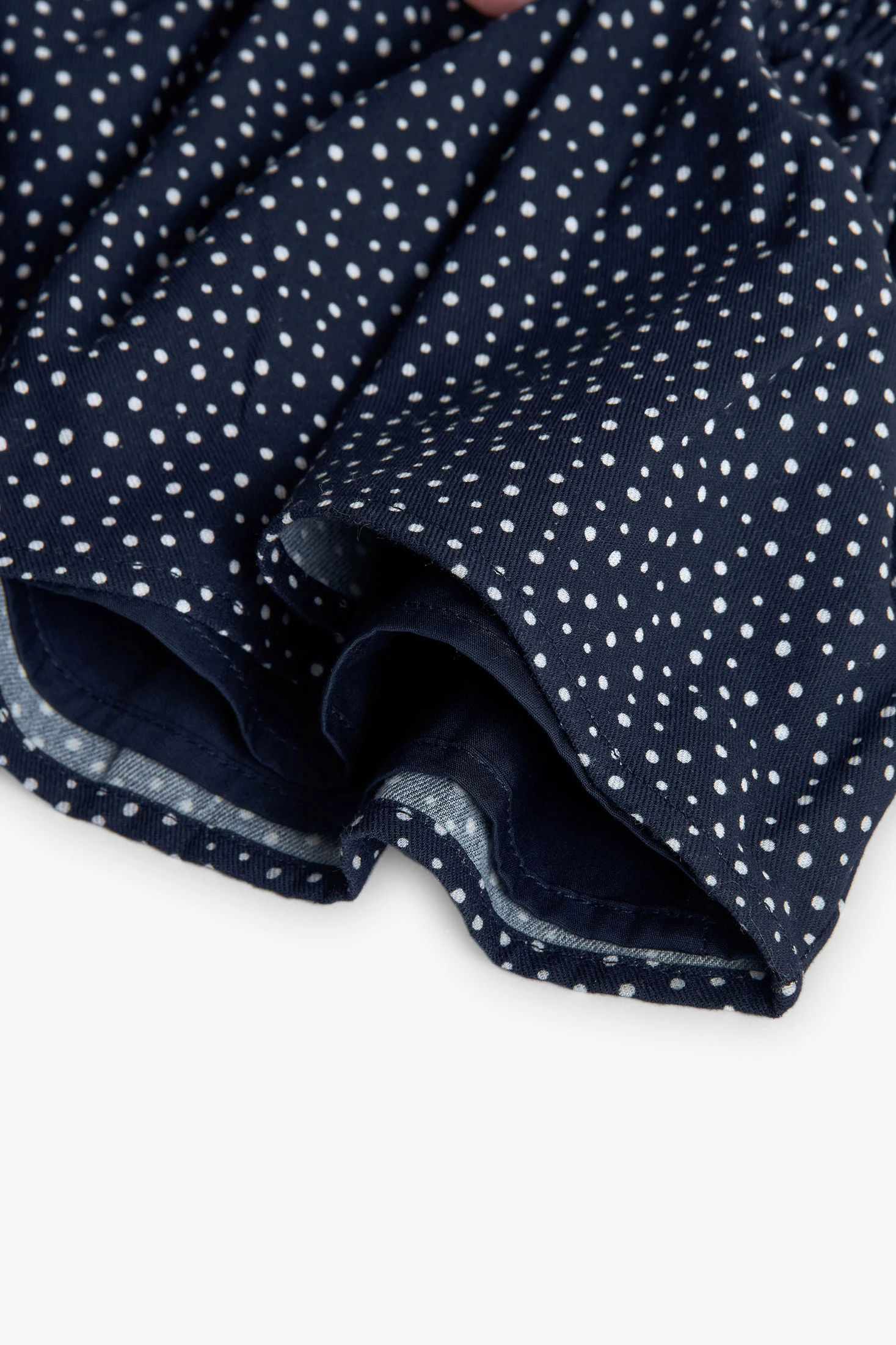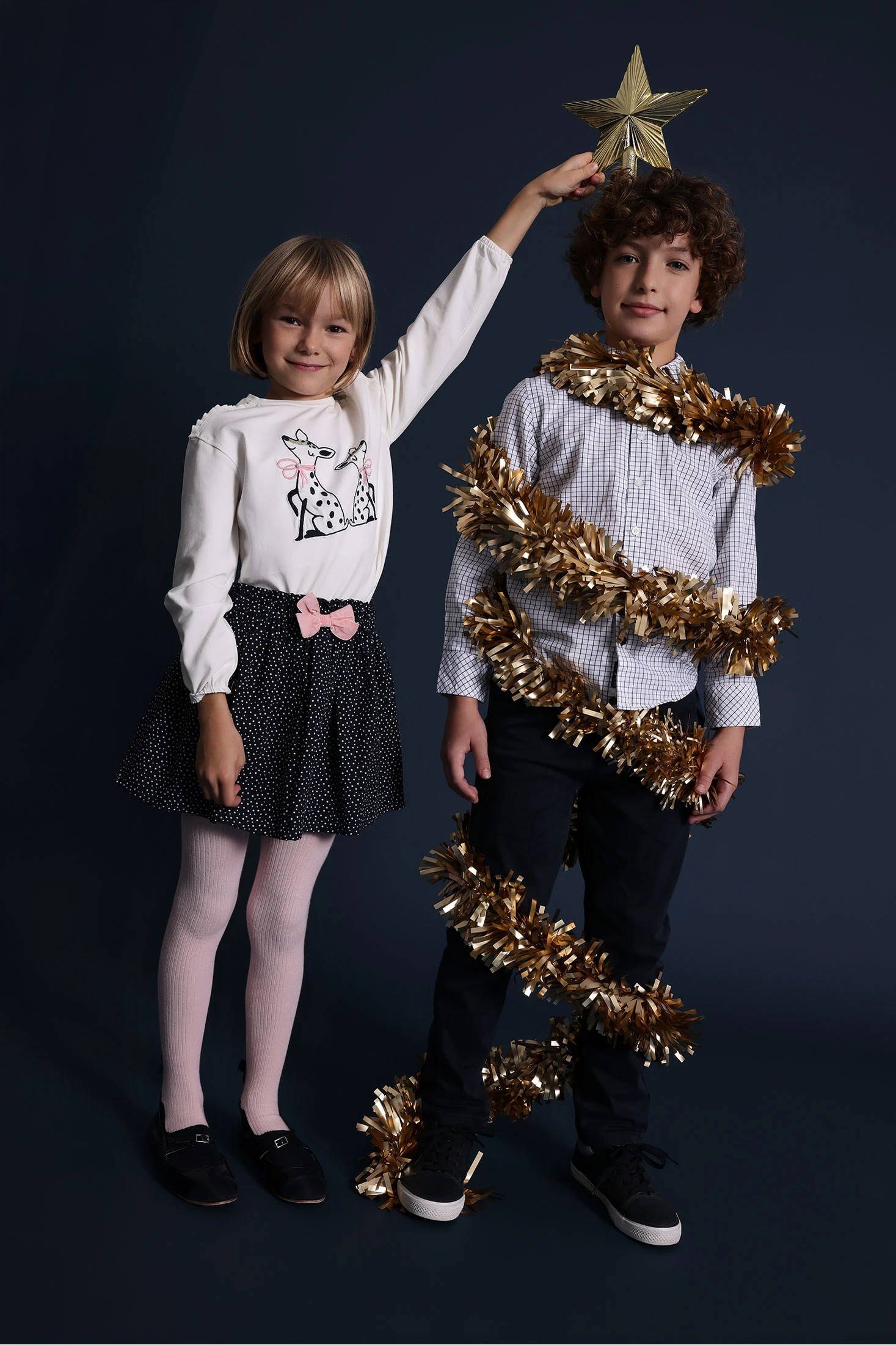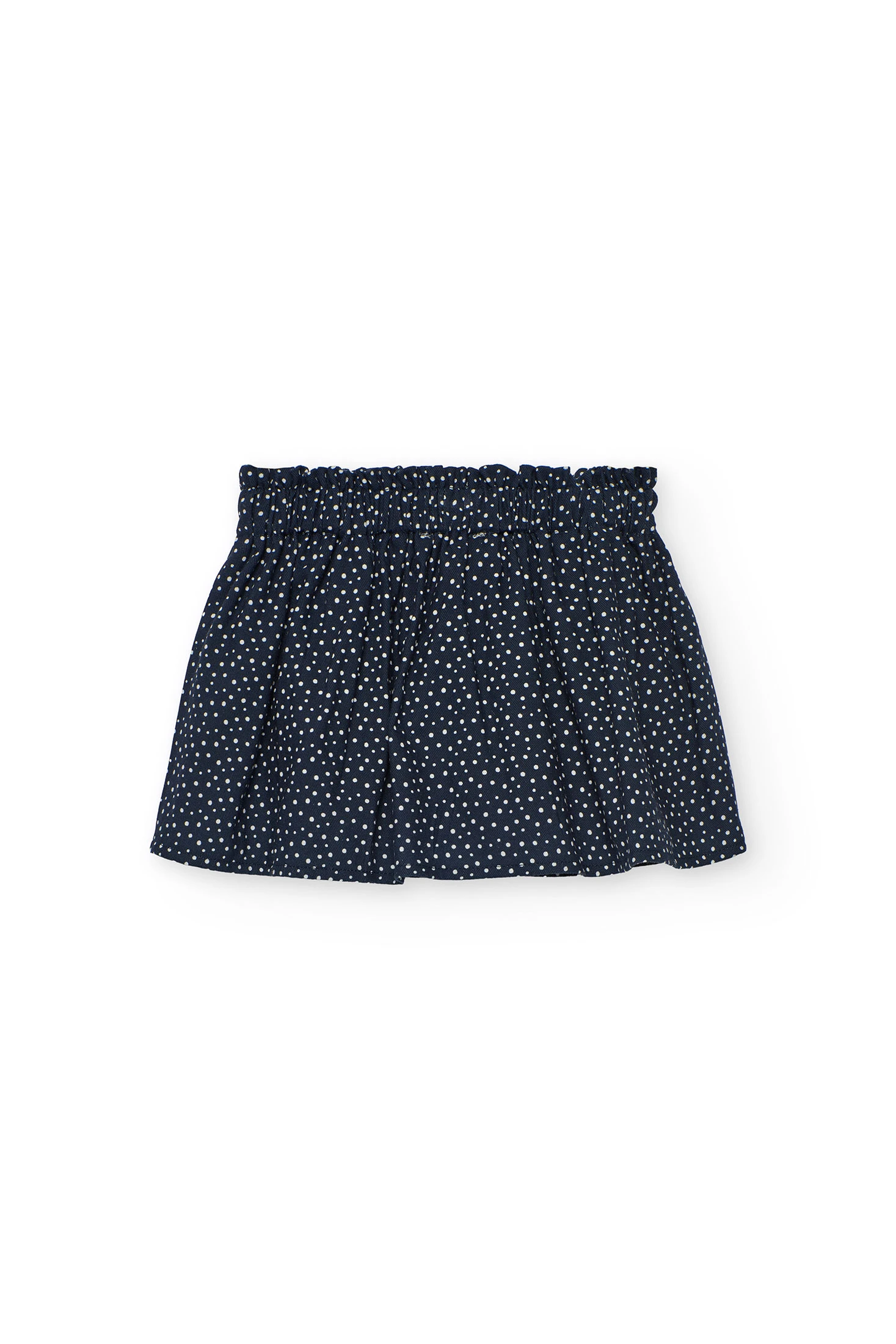 Navy blue skirt with polka dots, perfect for an elegant and cheerful look for girls. Ideal for the autumn and winter season, thanks to its warm and soft-to-touch material. Available in sizes from 12 months to 10 years, ensuring a perfect fit for different ages. Its classic design with white polka dots and a flowing cut makes it a versatile piece that can be paired with light-toned blouses or jumpers. Ideal for special occasions or to add a touch of style to everyday wear.