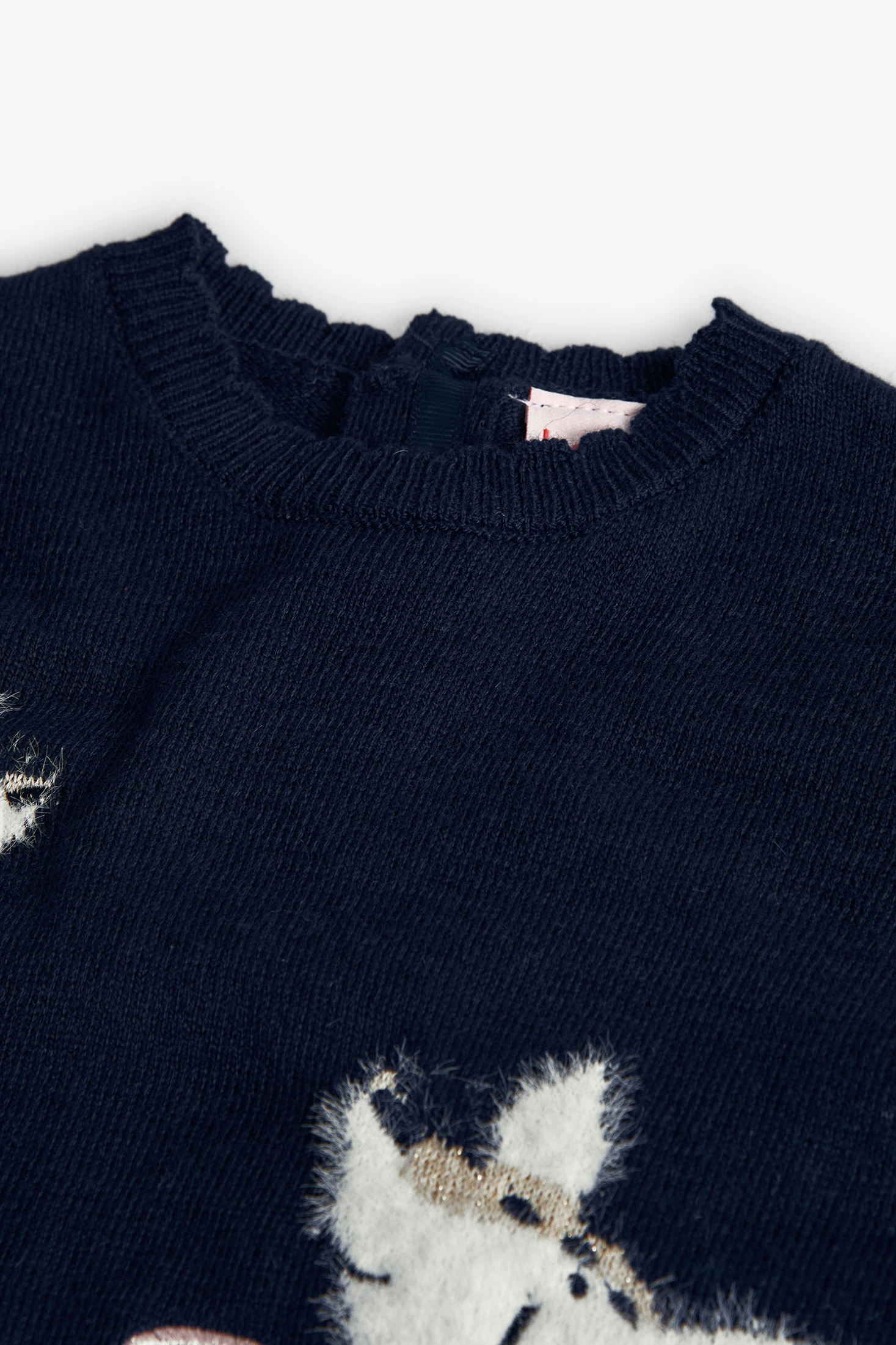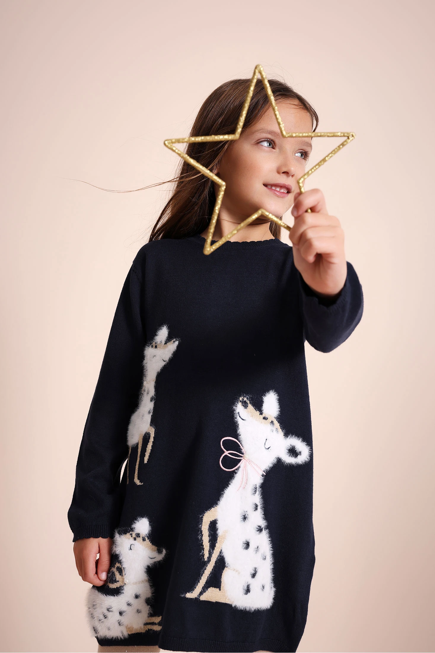 Soft navy knitted dress for girls, adorned with a charming animal design in warm tones, ideal for autumn and winter. The construction ensures warmth and comfort, featuring a round neck and long sleeves. Available from 12 months to 10 years, it pairs perfectly with tights or leotards, offering style and comfort in little ones' everyday wardrobe.