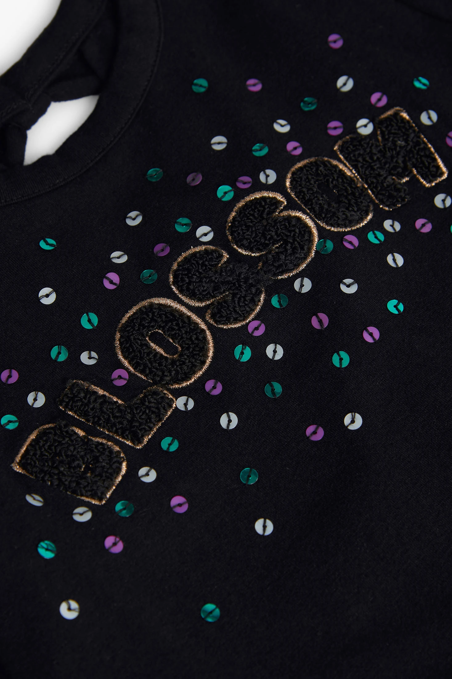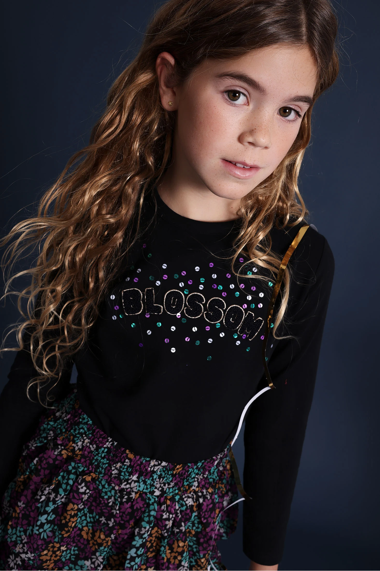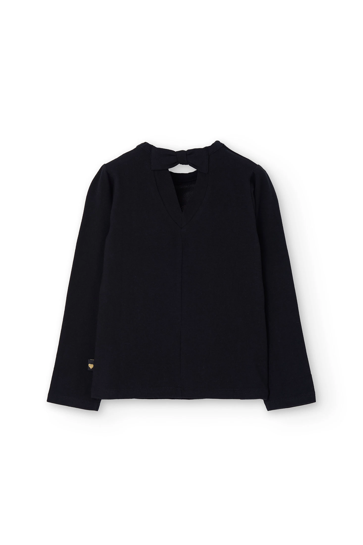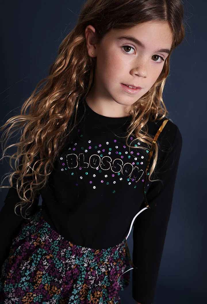 Black knit T-shirt for girls, made from soft cotton, ideal for the autumn and winter months. Designed with long sleeves and a round neck, it ensures comfort and warmth on the coldest days. Available in sizes from 2 to 14 years, it allows for versatile combinations with trousers or skirts for a casual and modern look. Decorative metallic details add a touch of style, making this T-shirt a trendy option for any girl's wardrobe.