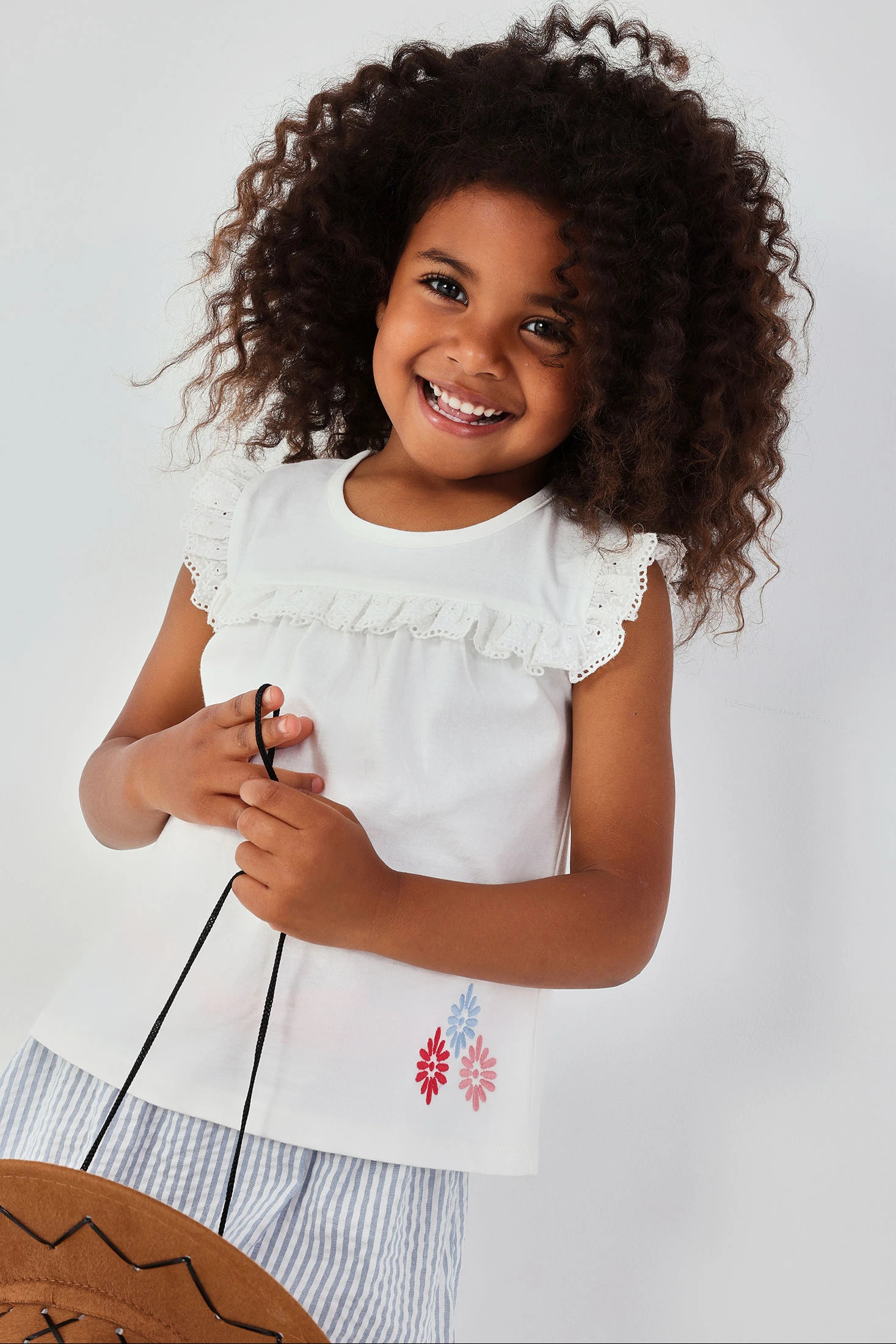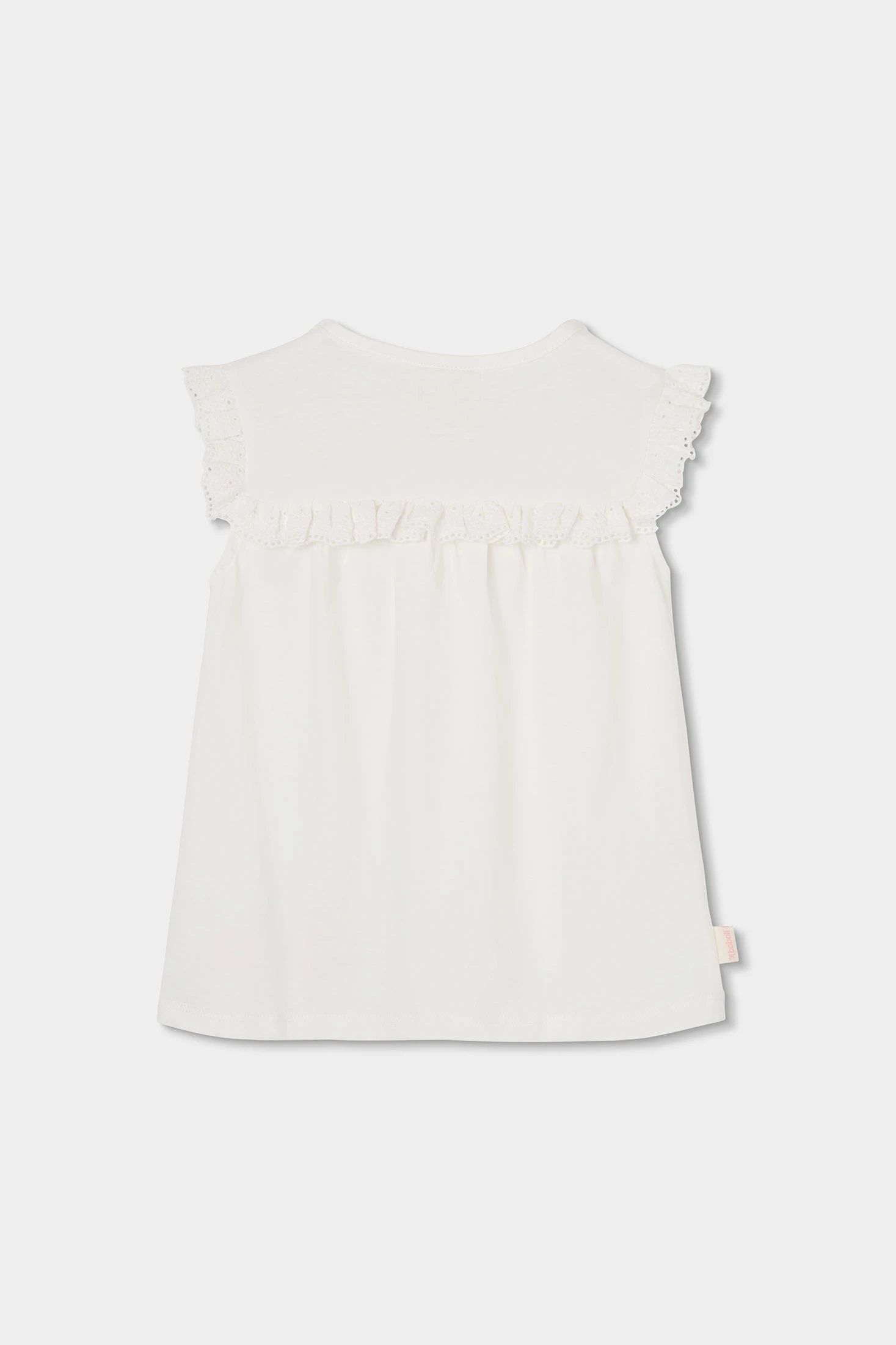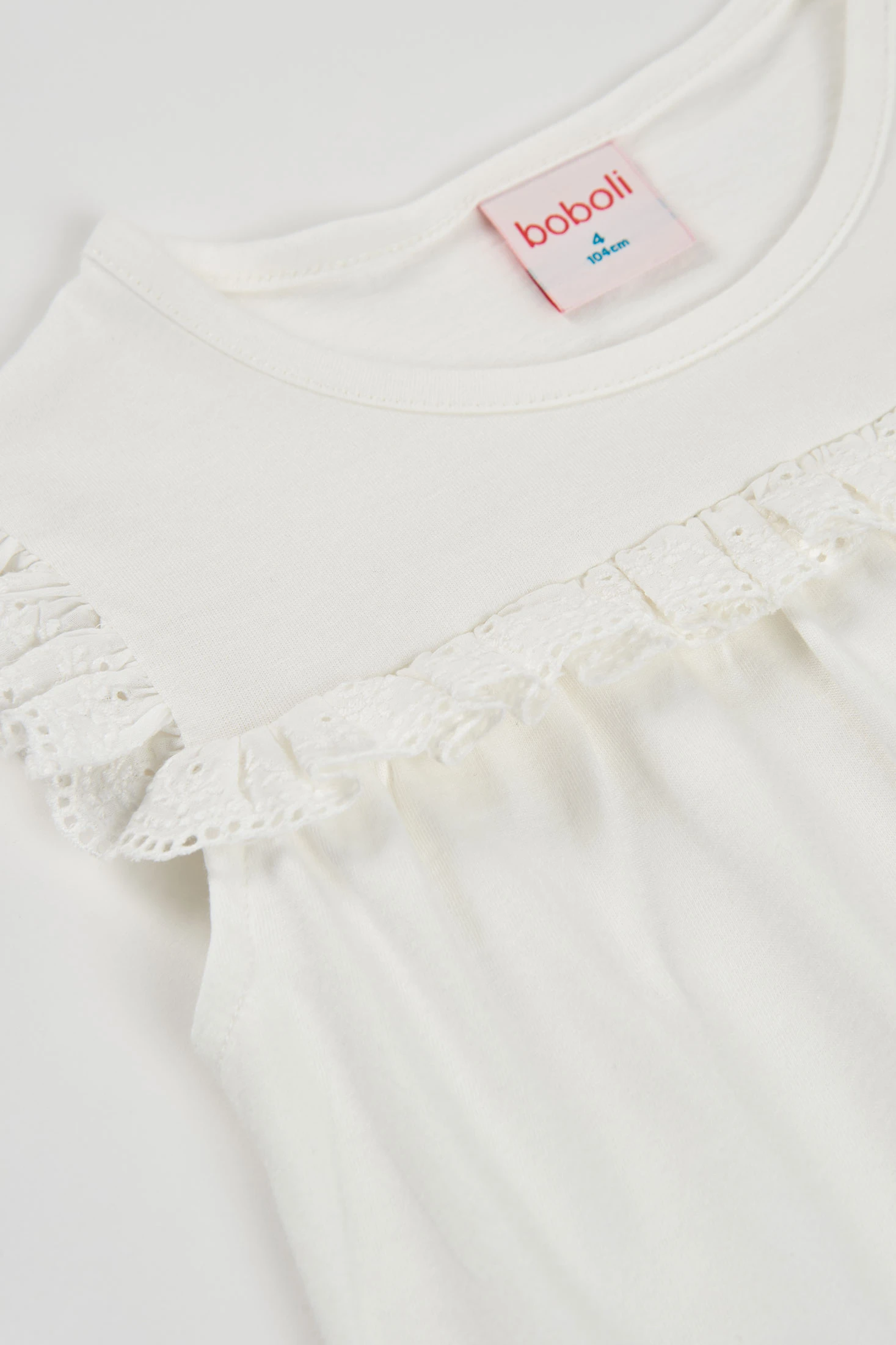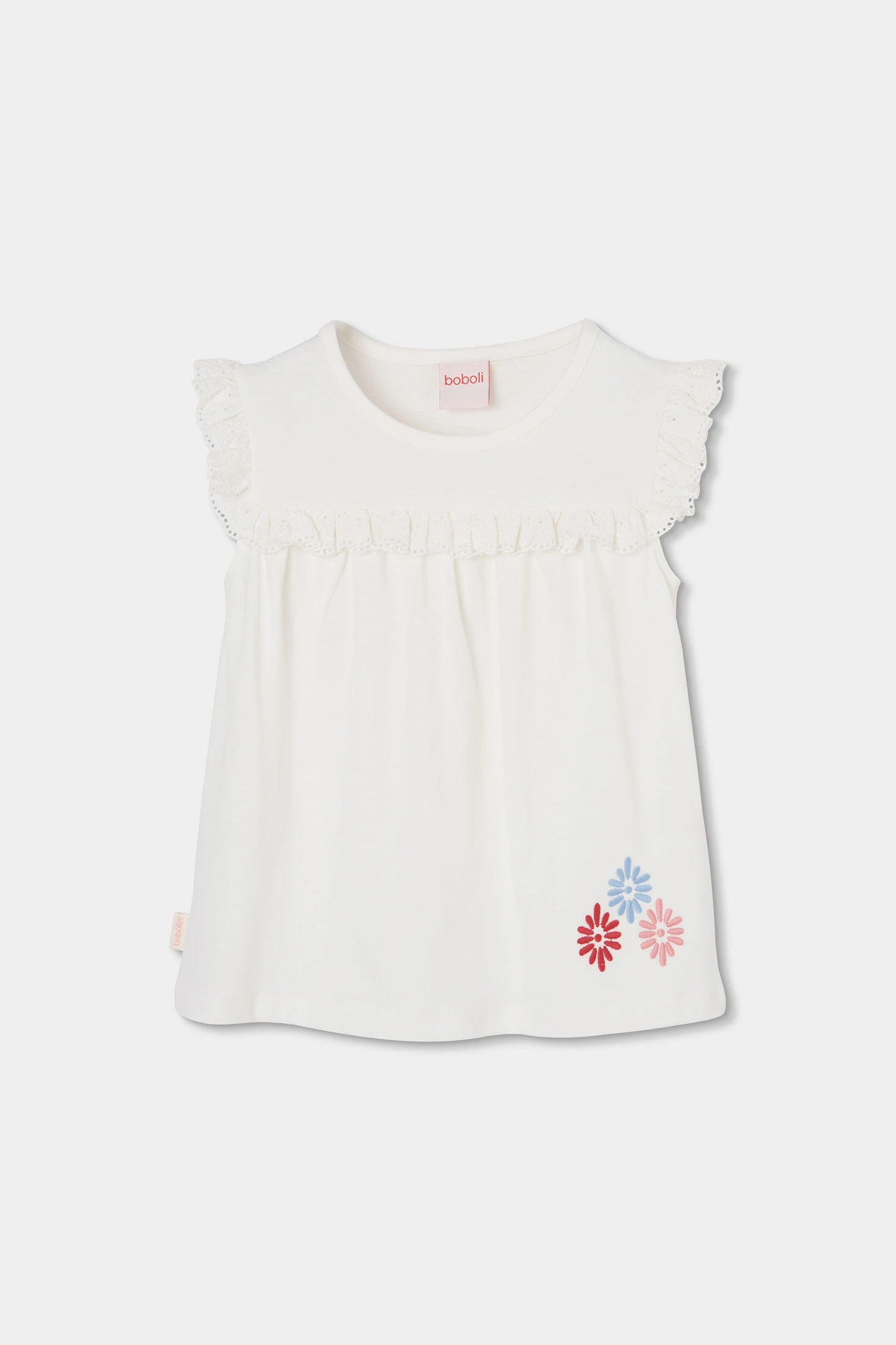 White cotton knit T-shirt for girls, perfect for any occasion. Its design features ruffled details on the sleeves and embroidered flowers at the hem. Made from soft and comfortable fabric. Available in sizes from 12 months to 10 years, accommodating growth. Its versatile style easily pairs with skirts or trousers. An essential garment for children?s wardrobes, offering comfort and style for everyday wear.