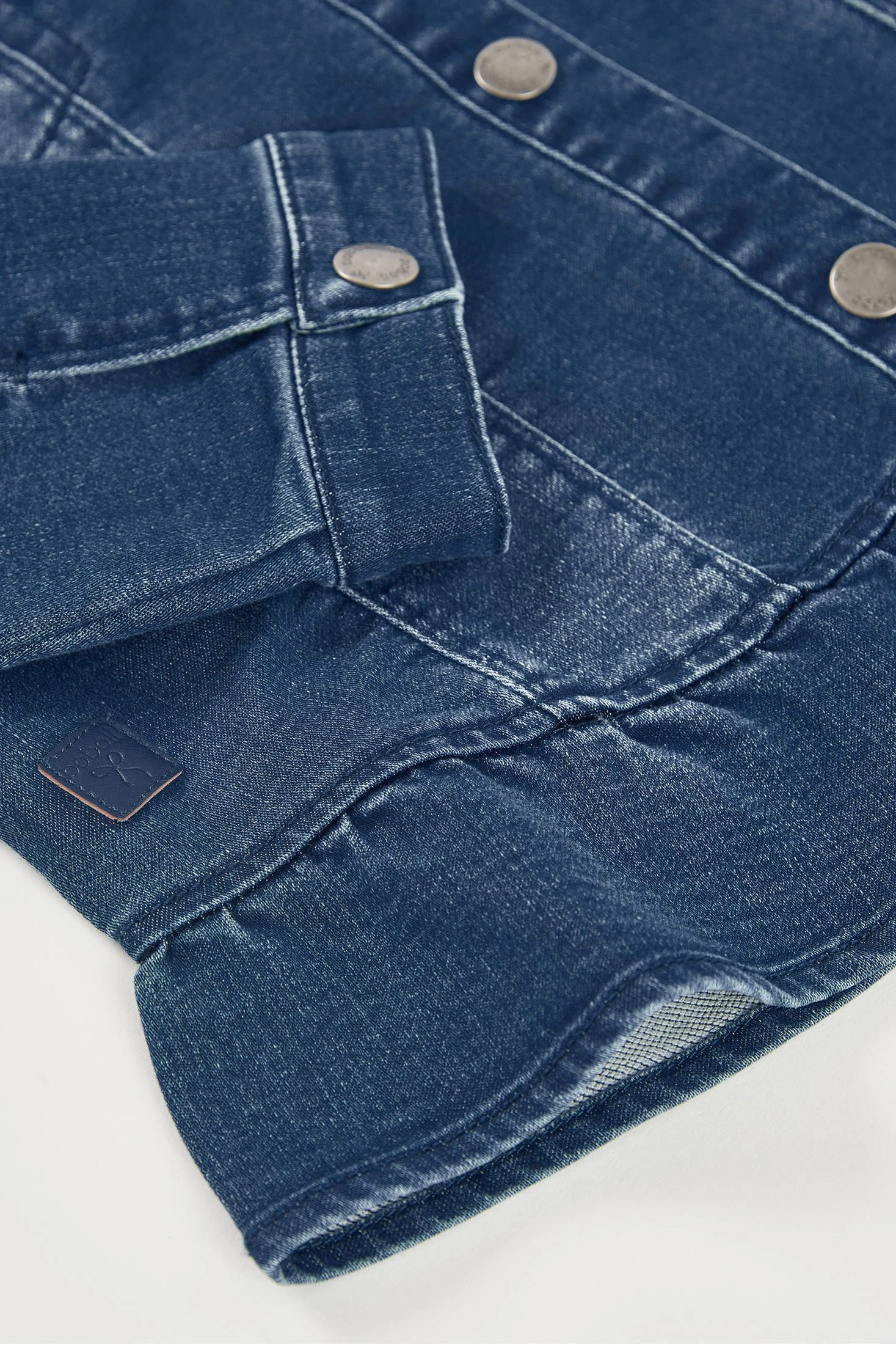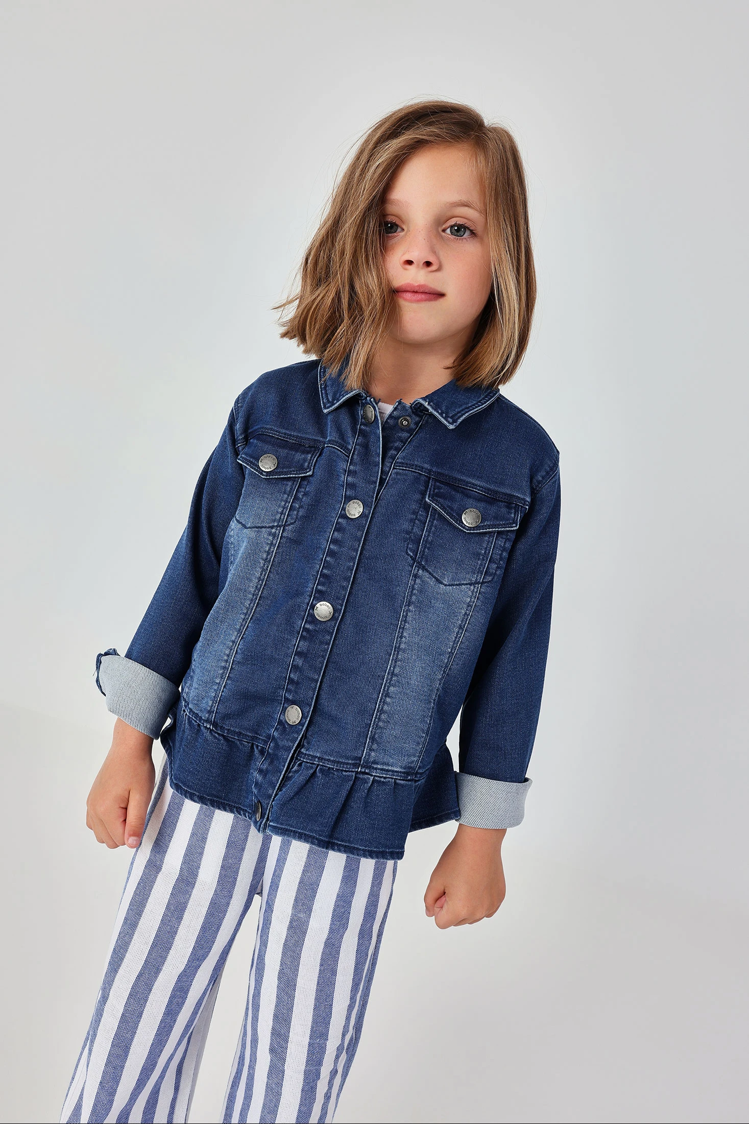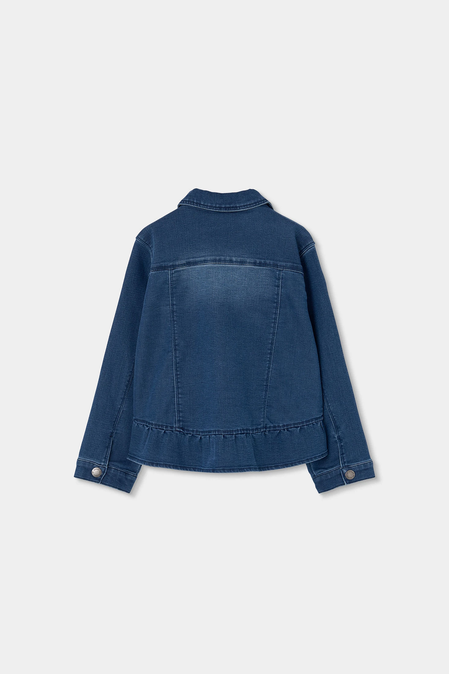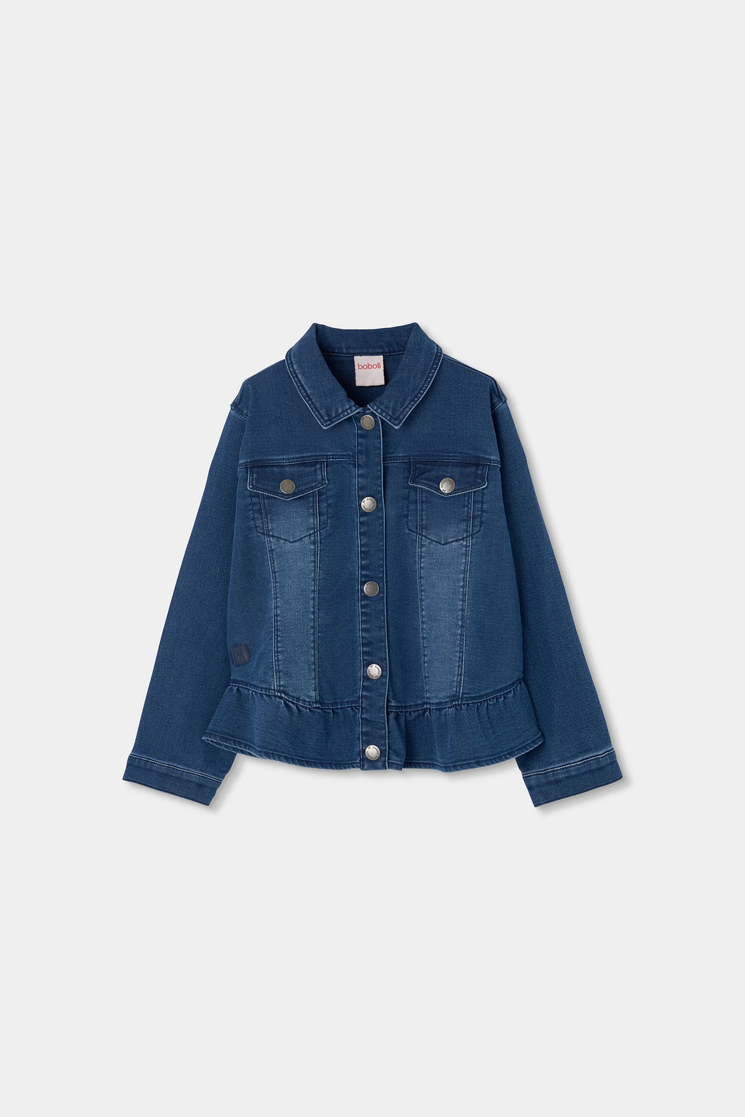 Dark blue denim jacket, perfect for the mid-season, crafted from denim material that offers both style and durability. It features a design with front pockets and ruffle details at the hem, adding a distinctive touch. Ideal for ages from 12 months to 10 years. It pairs perfectly with casual trousers or skirts, providing a modern and comfortable look for everyday wear.