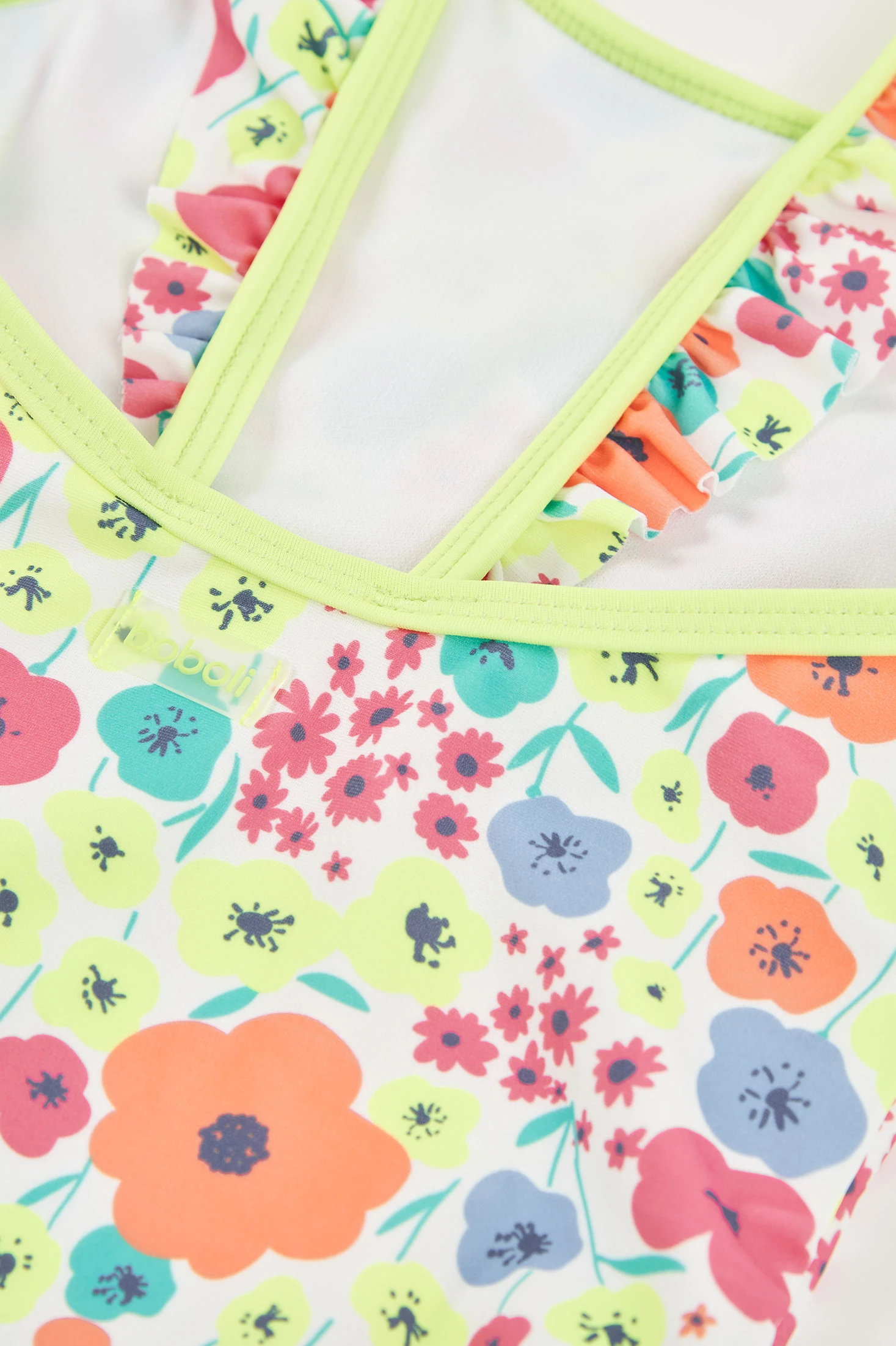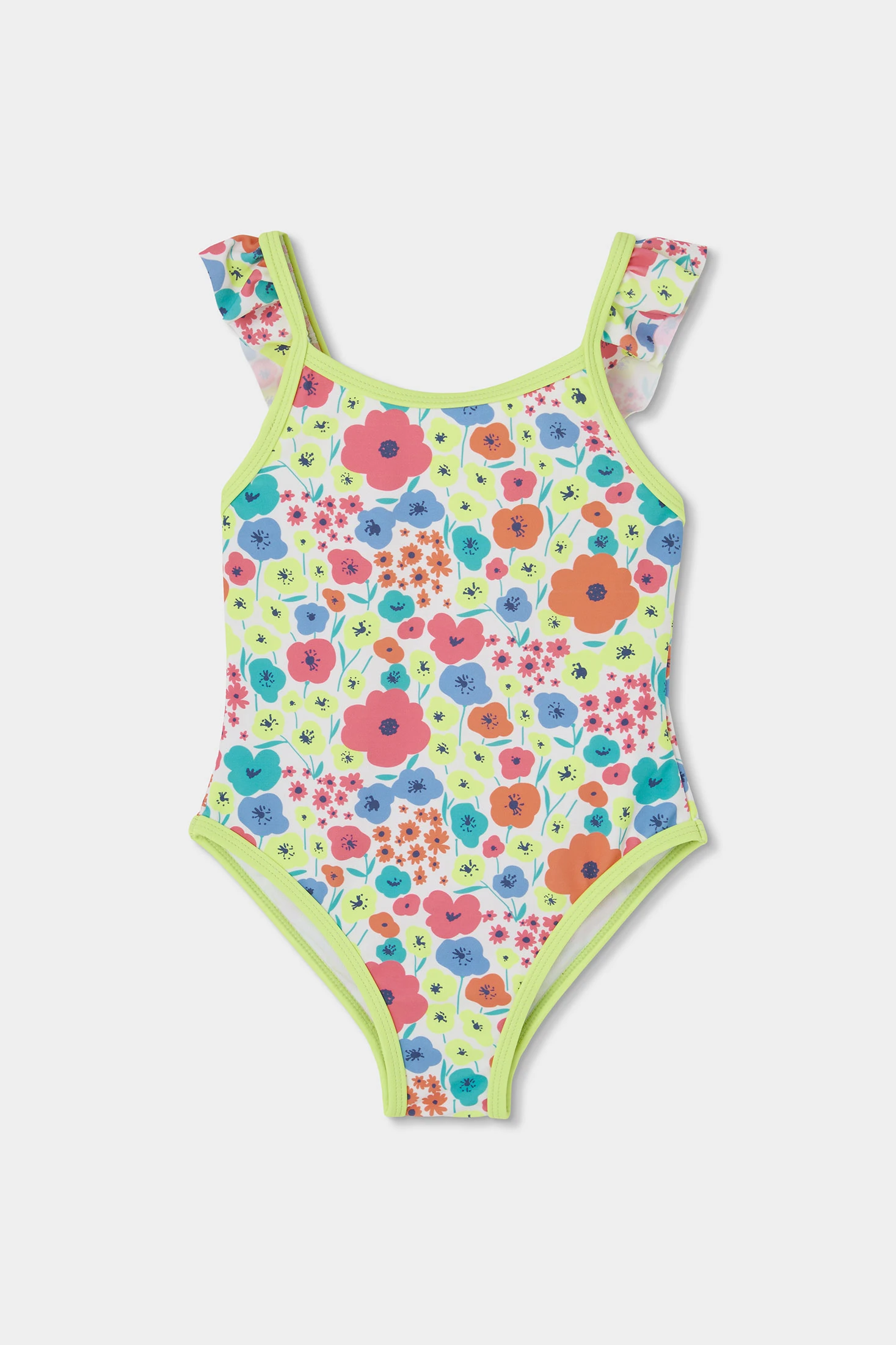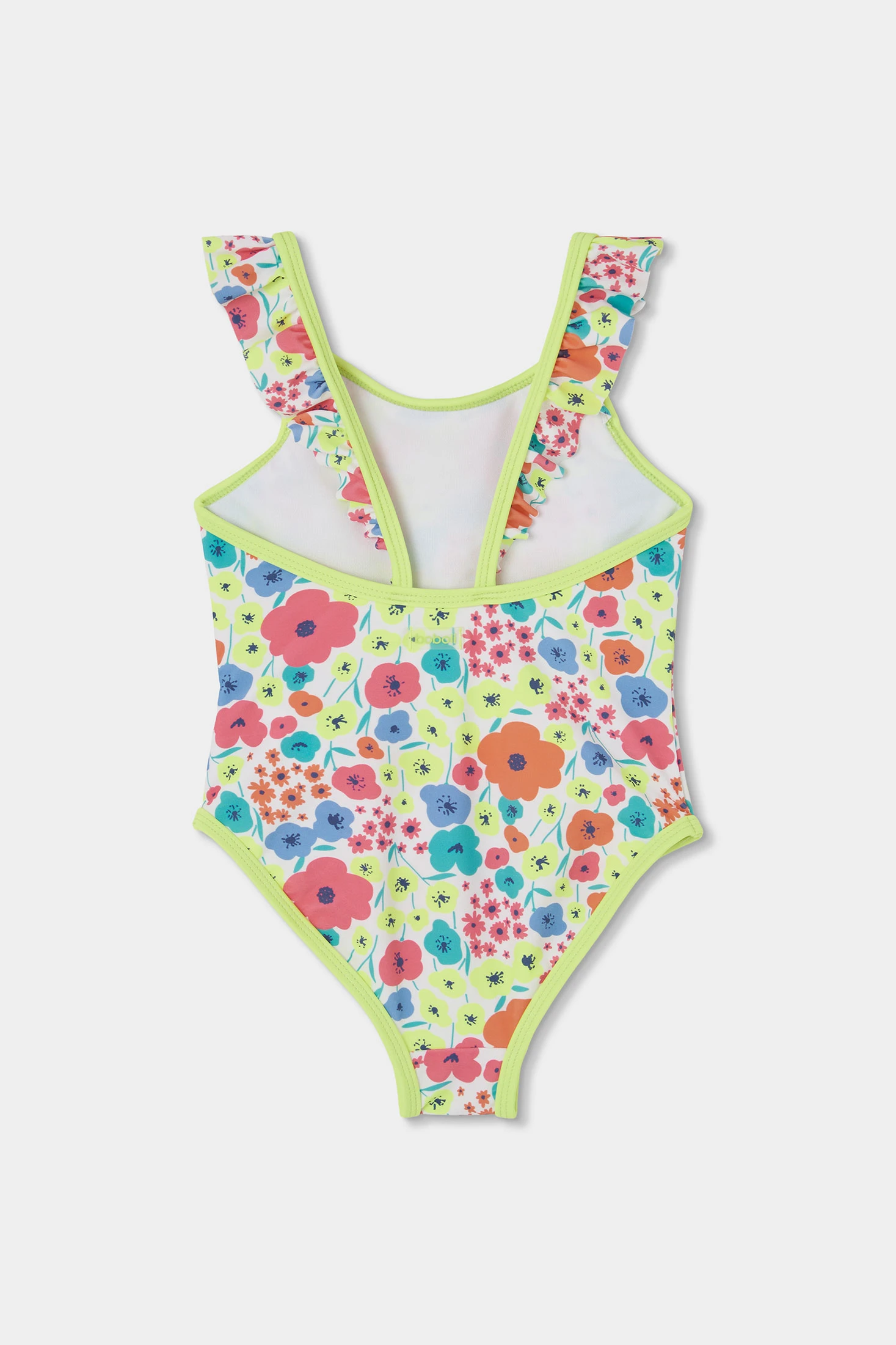 Girl?s swimsuit with multicoloured floral print, perfect for enjoying the summer. Crafted from water-resistant material that ensures comfort and durability. The cheerful and colourful design with floral motifs makes it ideal for sunny days. The ruffled straps add a charming touch to the ensemble. Available in sizes from 12 months to 10 years, it adapts to each stage of growth. Its comfortable and secure fit is perfect for water activities, making this swimsuit a practical and comfortable choice. Garment with UPF50 sun protection.