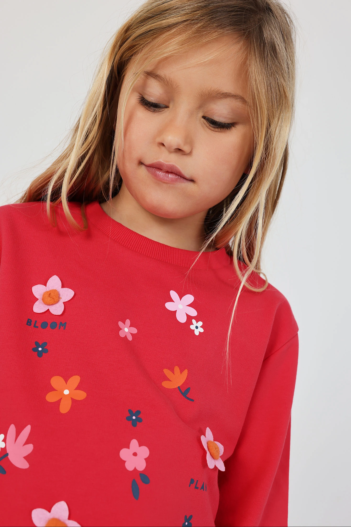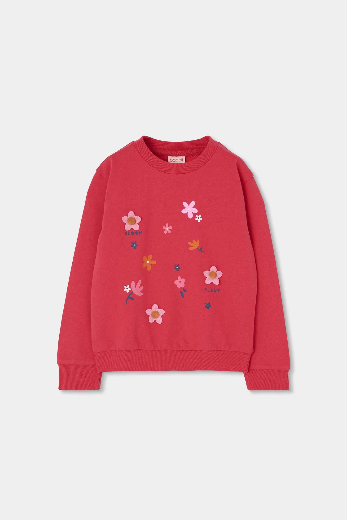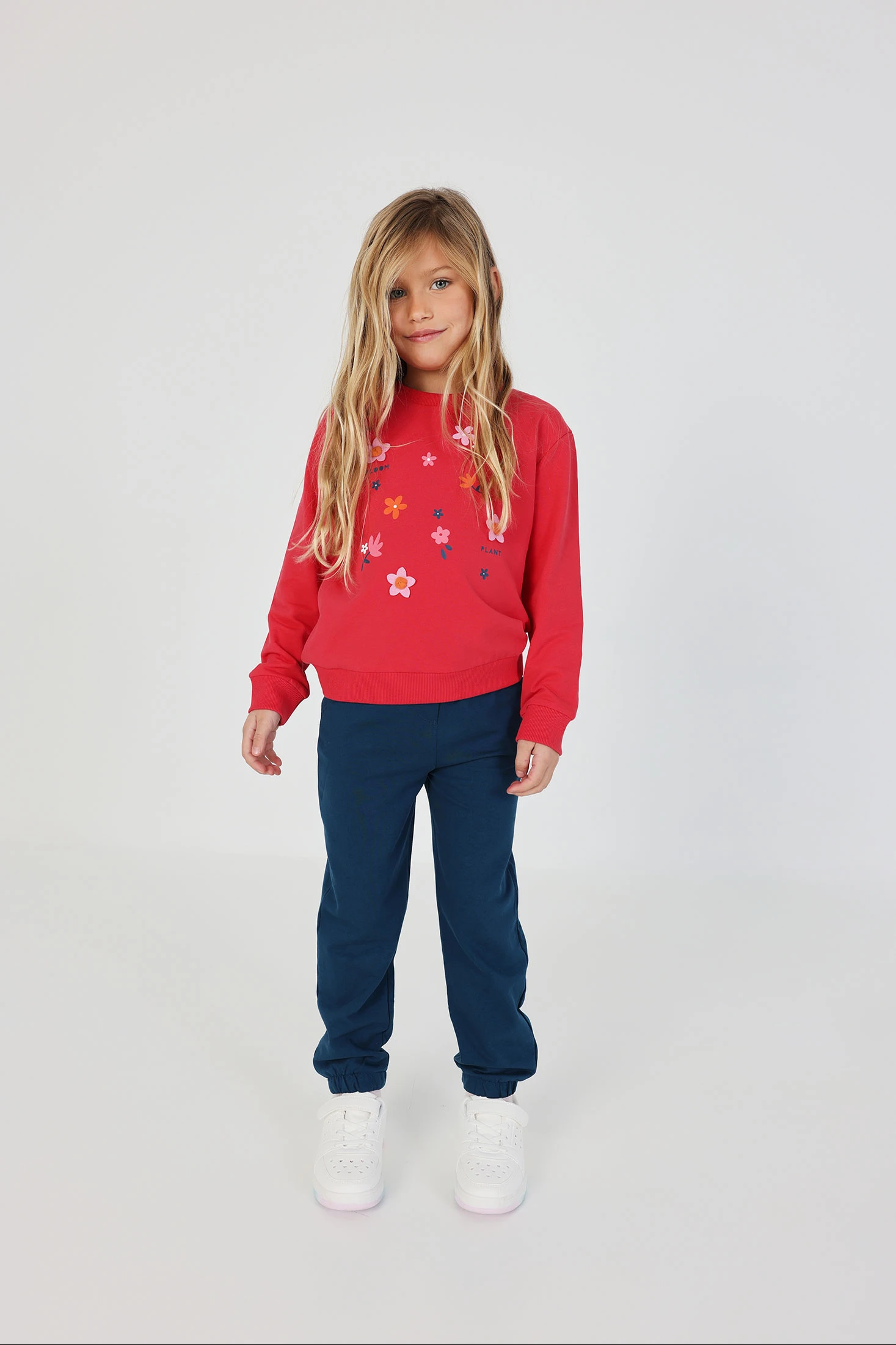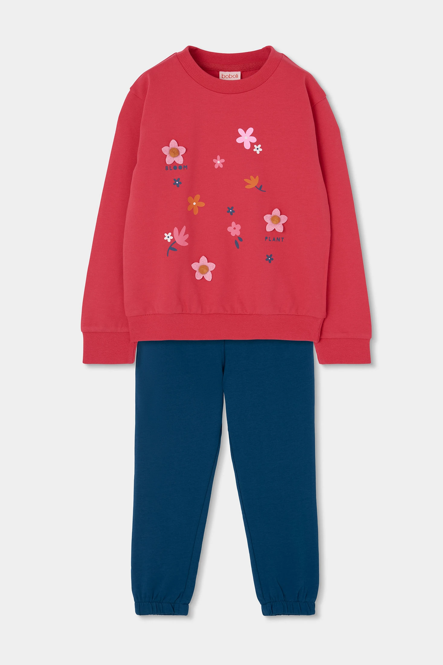 Cotton set for girls, perfect for daily comfort. Strawberry-coloured sweatshirt with floral designs and words, adding a fun touch. Navy blue trousers that easily complement the set. Ideal for girls from 12 months to 14 years, this garment offers comfort and style. Long sleeves and soft material make it excellent for cooler seasons. A versatile option that pairs well with different styles to keep your little one warm and fashionable.