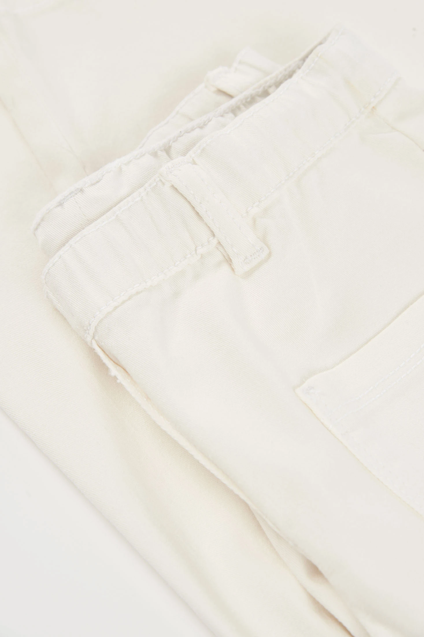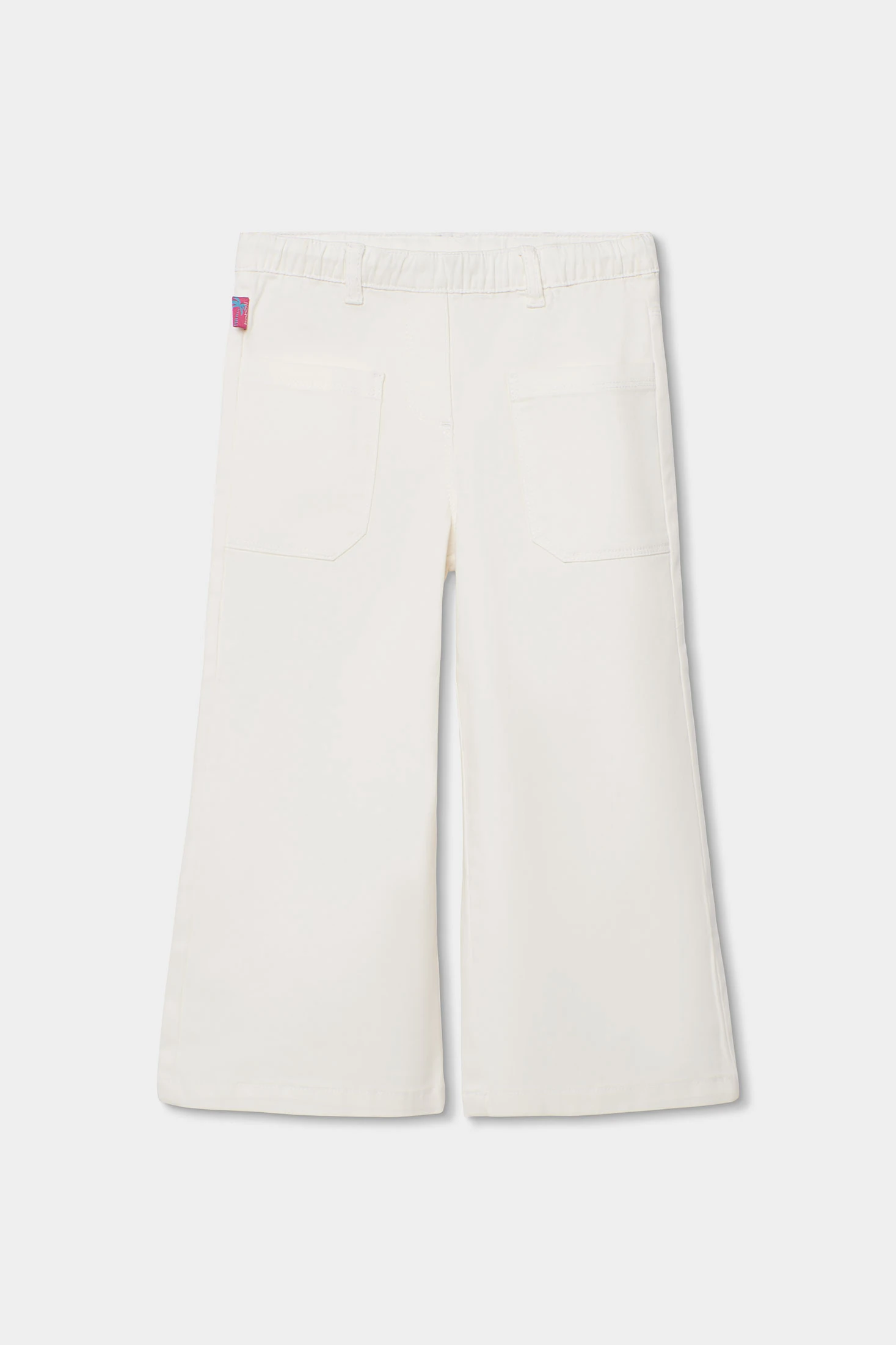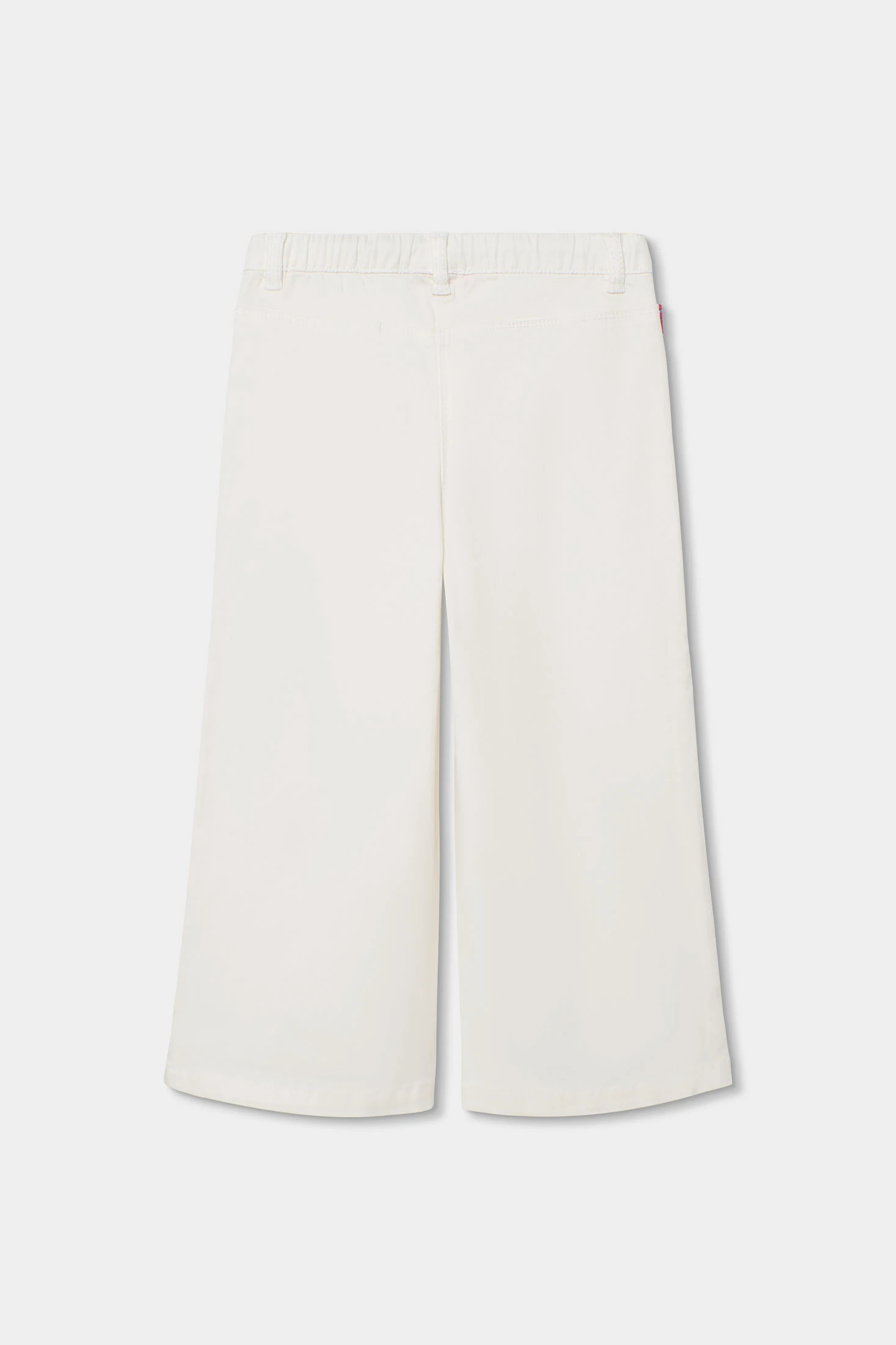 Elastic twill trousers with a wide design in white, intended for ages from 12 months to 10 years. Featuring front pockets and an adjustable elastic waistband for a customised fit. It is a perfect garment to pair with any style and colour. A good basic to have in the wardrobe.