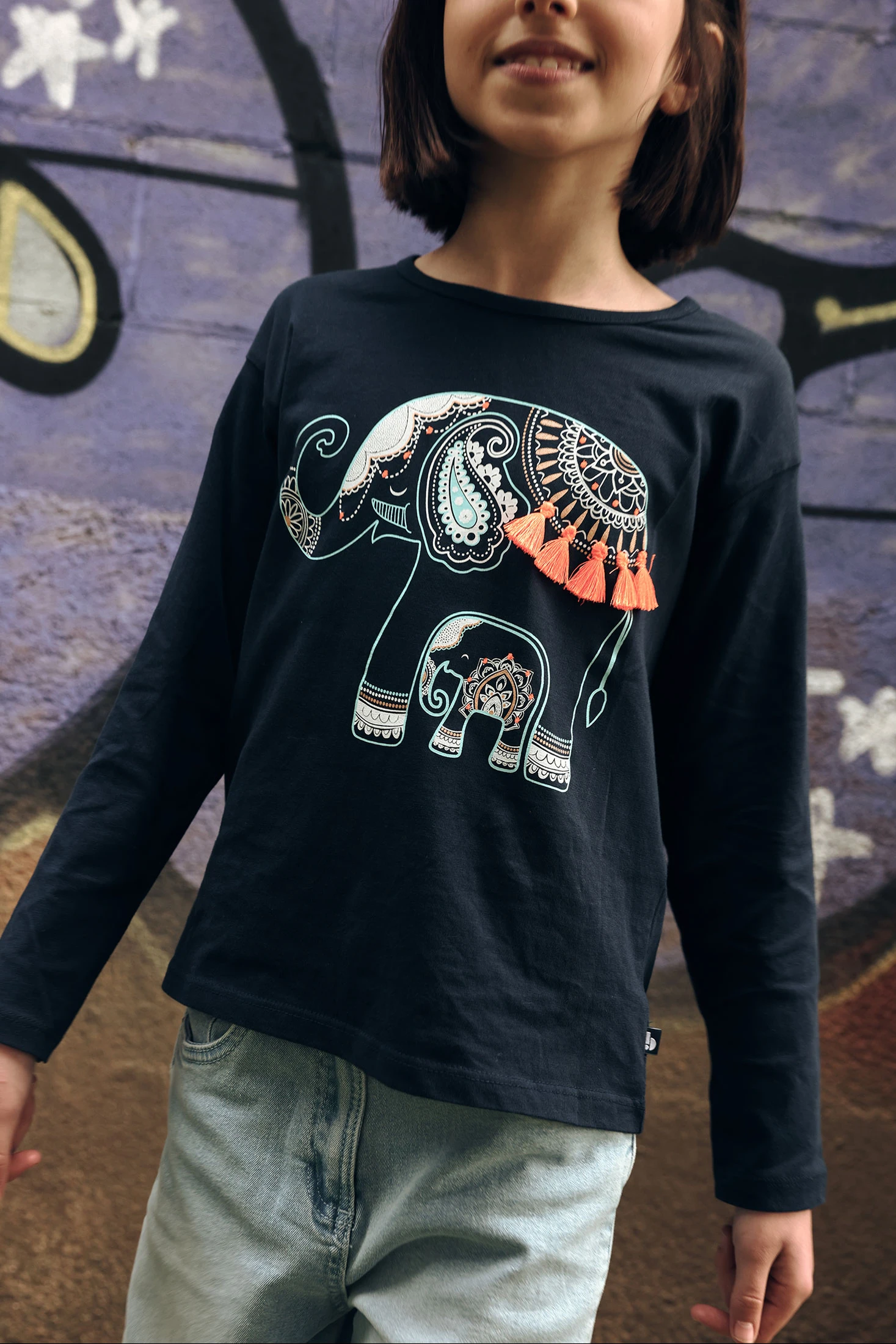 Navy blue knitted T-shirt for girls, ideal for the autumn and winter season. Made from cotton, it offers comfort and softness. It features a charming elephant design with decorative details. The round neck and long sleeves are perfect for colder days. Available in sizes from 12 months to 14 years, it adapts to each girl?s growth. This T-shirt is versatile and easy to pair, perfect for a casual and comfortable look on any occasion.
