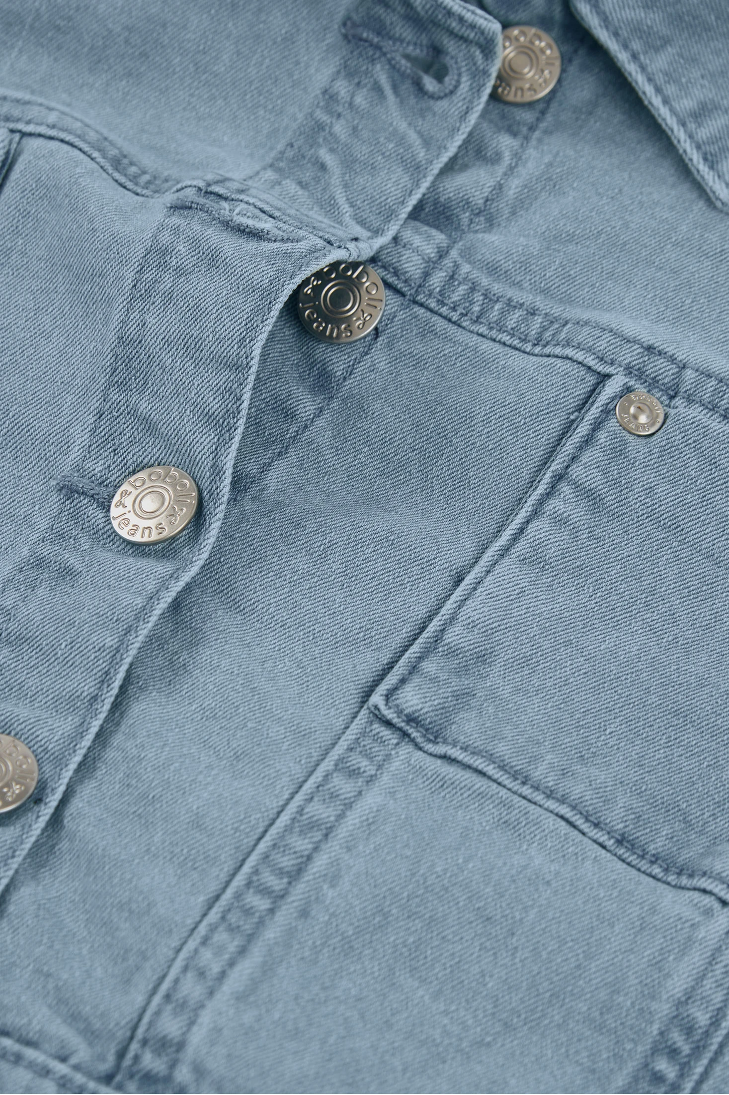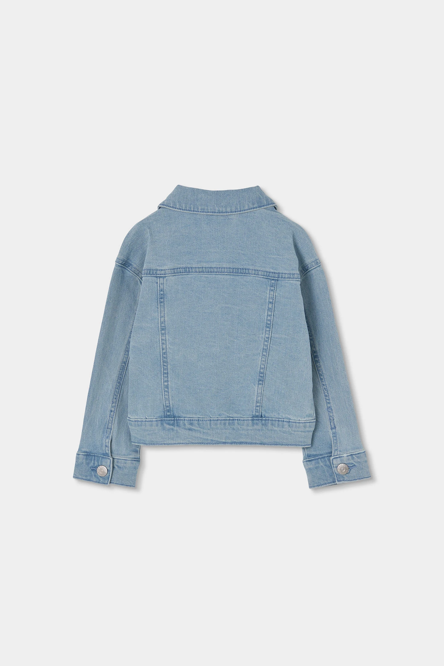 Denim jacket for girls, in light blue, perfect for a casual and modern look. Made of cotton, it offers comfort and durability. It features a classic design with buttons on the front and functional pockets. Available in sizes ranging from 12 months to 14 years, catering to different ages. Its versatile style allows for easy pairing with dresses or trousers, ideal for the mid-season.