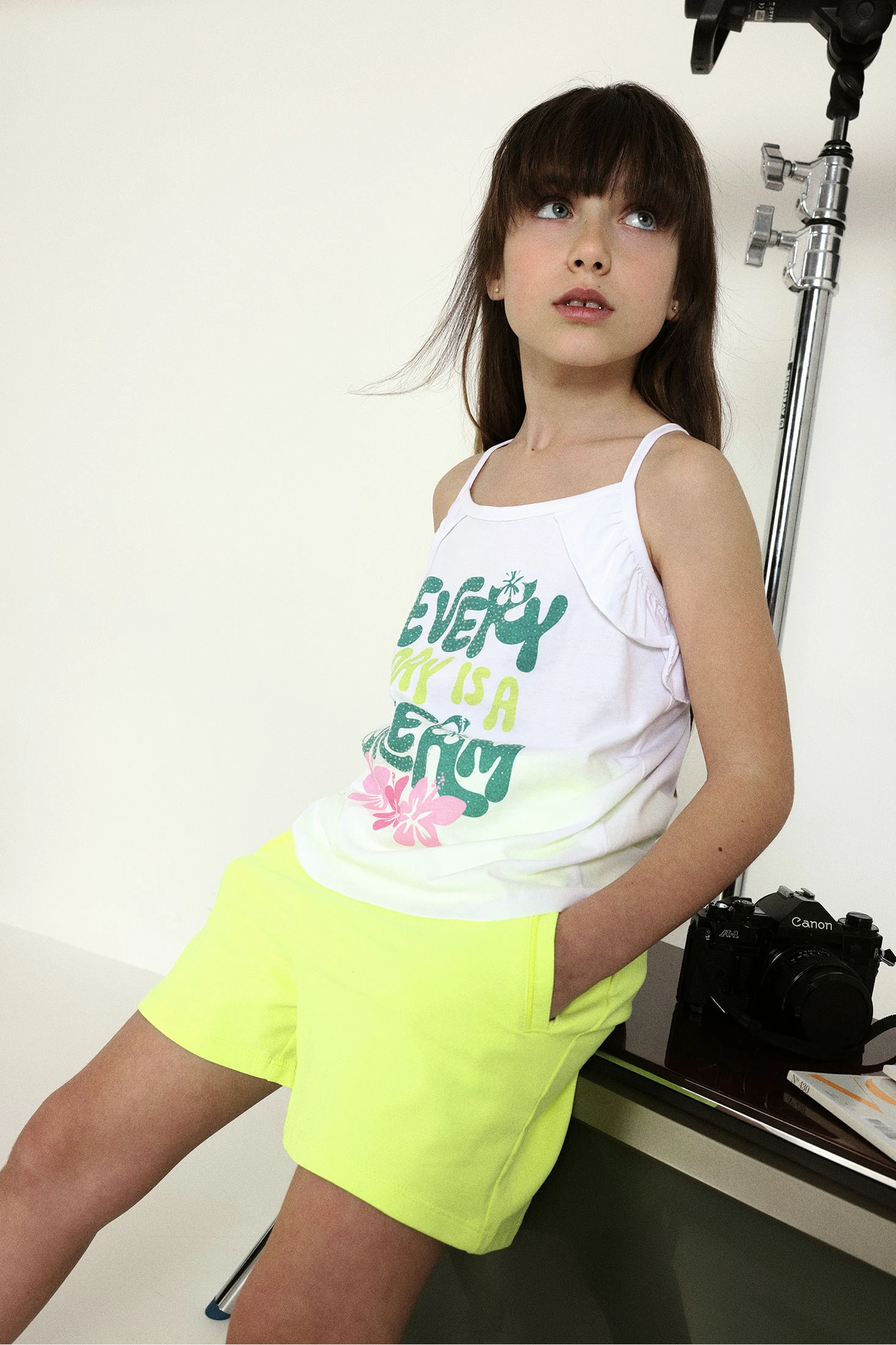 Sleeveless T-shirt for girls made from white jersey fabric, perfect for the warmer months. It features a striking colourful print with text and flowers, offering a fresh and cheerful style. Designed for girls aged 2 to 14 years, it ensures a perfect fit at every stage. Thin straps and lightweight material guarantee all-day comfort. Perfect to pair with shorts or skirts, adding a summery touch to any outfit.