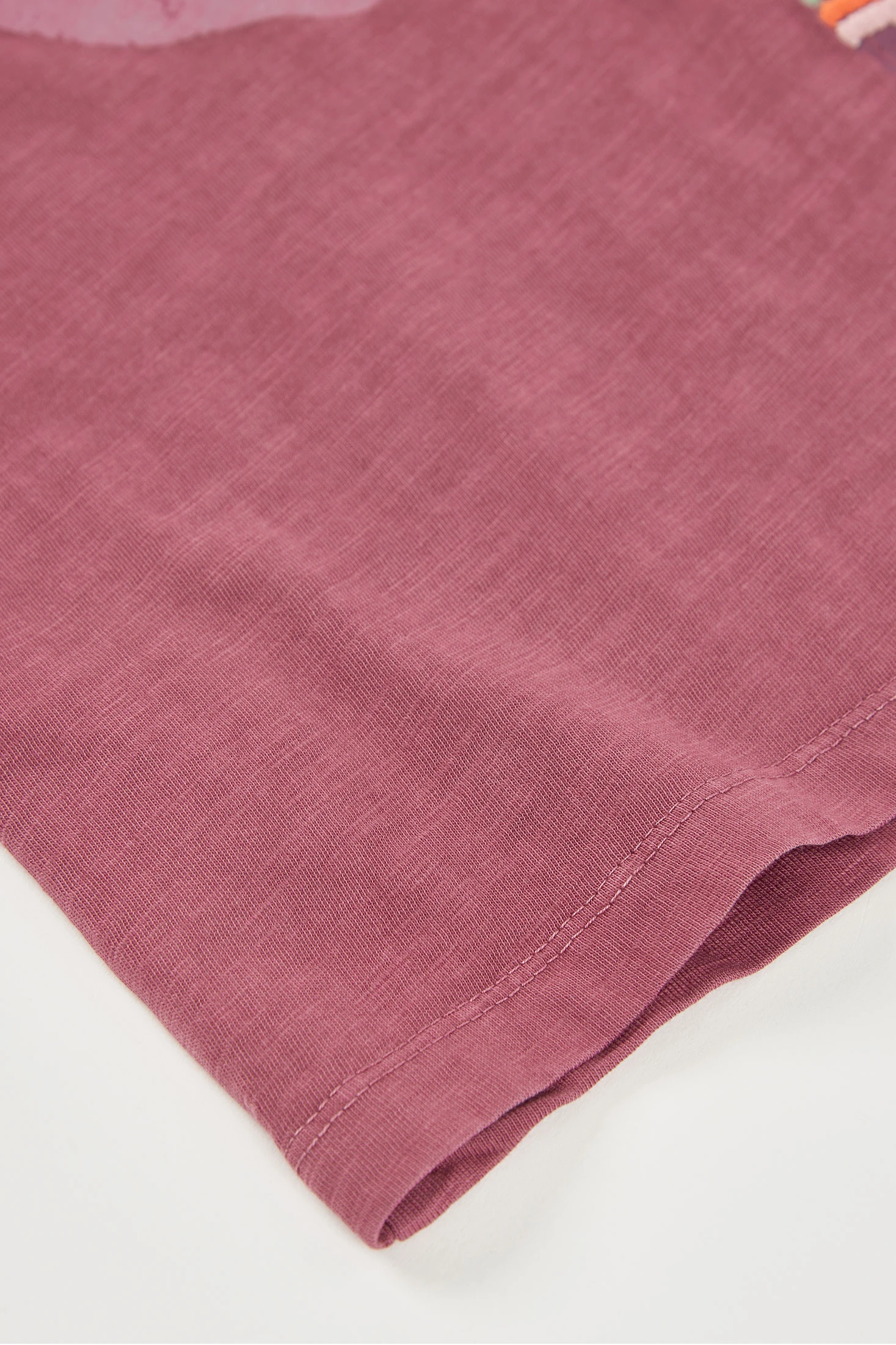 Cotton T-shirt for girls, in a soft plum shade, perfect for everyday wear. The design features a palm tree print that adds a tropical and fun touch. With a round neck and short sleeves, it is ideal for the warmer seasons. Available in sizes from 2 to 14 years, it adapts to girls' growth. Its cotton fabric is comfortable and breathable, ensuring a soft feel against the skin. A versatile garment that can be paired with a skirt or trousers for a casual and fresh style.