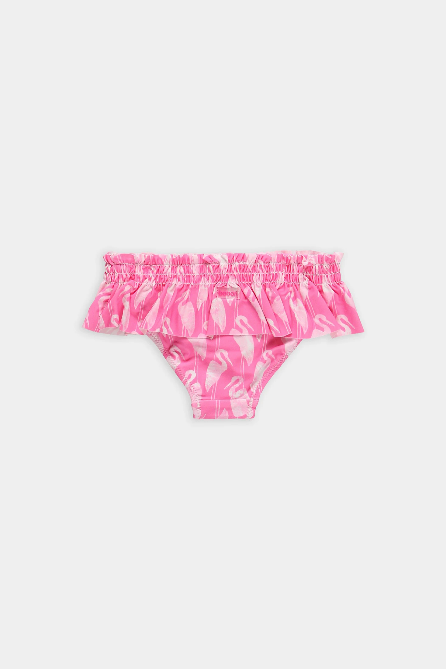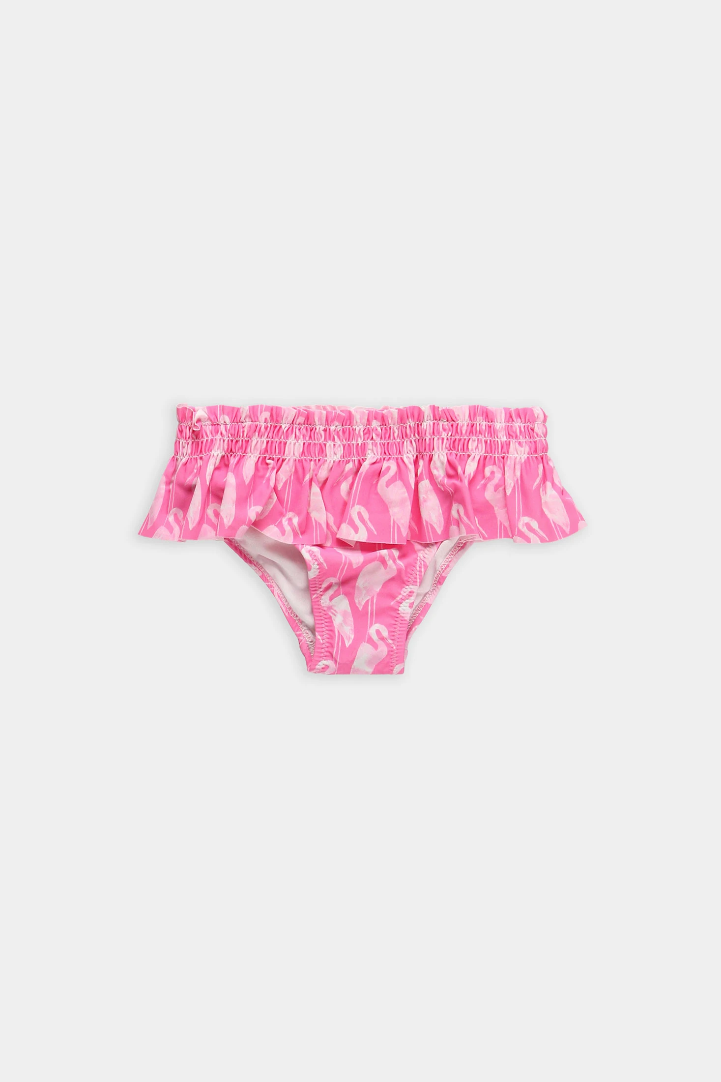 Girl?s swimsuit in pink with fun flamingo prints that add a colorful and playful touch. Ideal for little ones, available in sizes from 12 months to 10 years. Made of soft fabric with UPF50 sun protection, ensuring comfort and freedom of movement. The ruffles around the waist add a fun detail to the piece. A perfect option for warm days, combining comfort and style for any occasion.