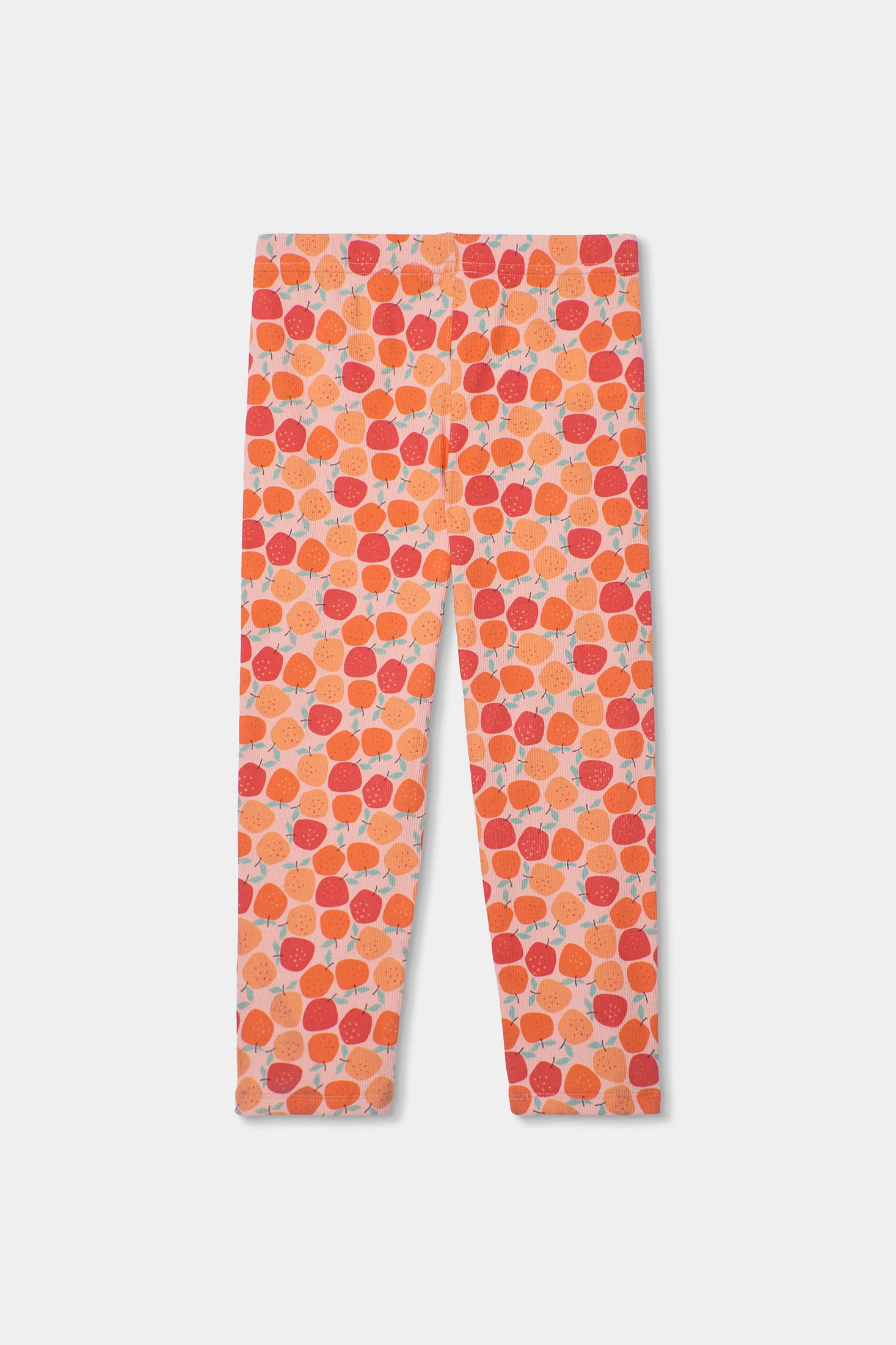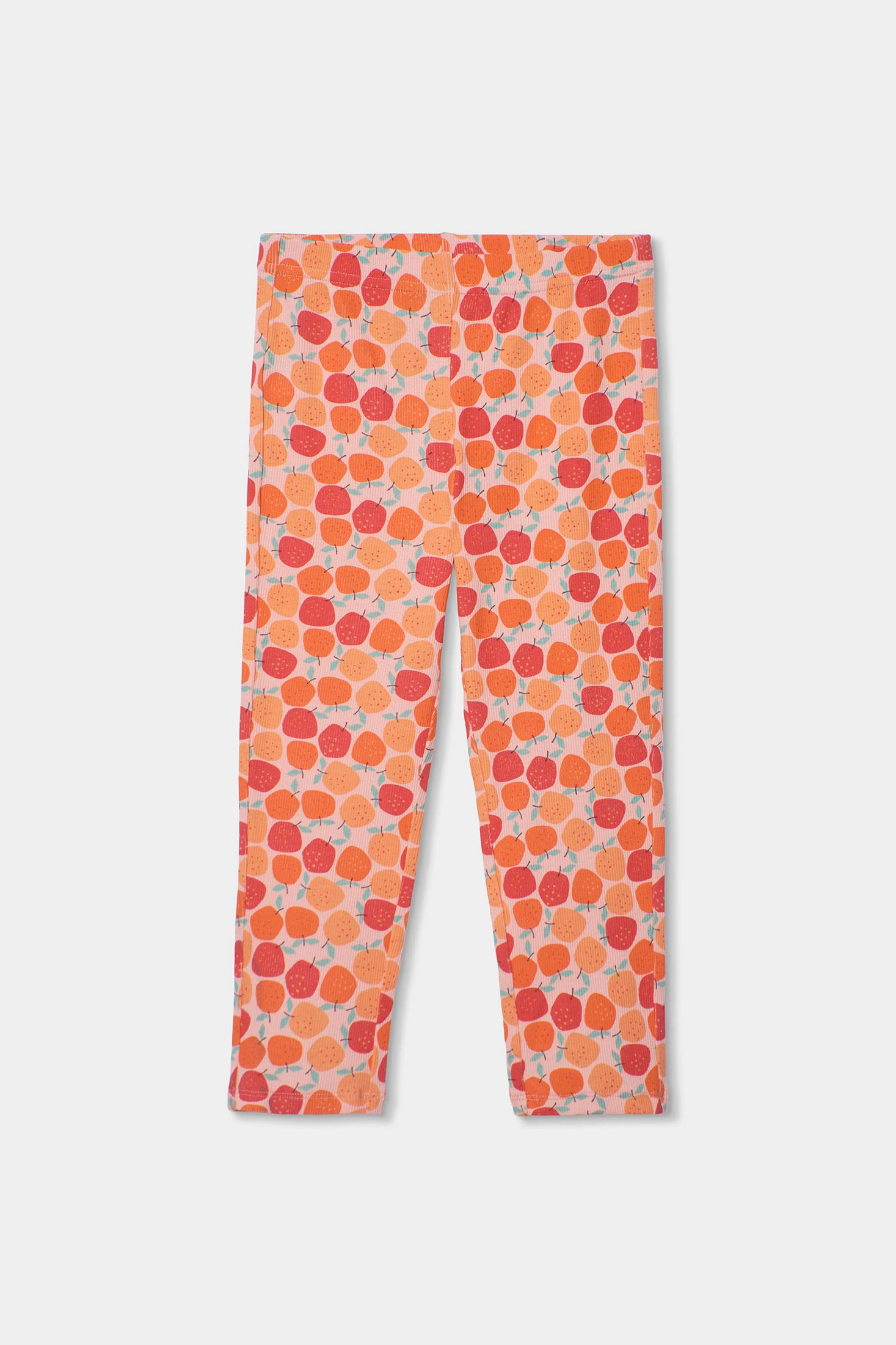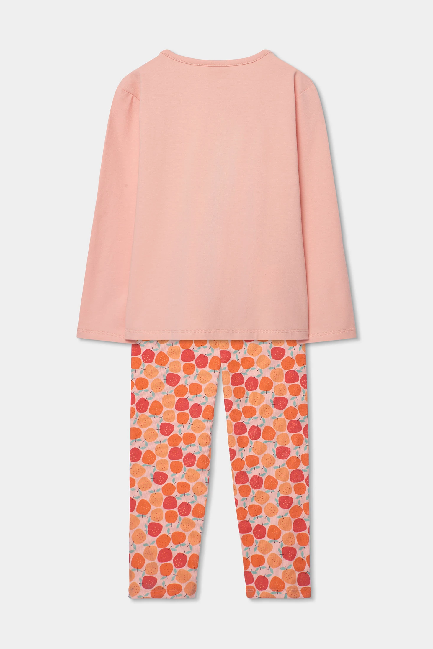 Knitted pyjamas for girls, in a soft salmon tone, perfect for the colder months. Made from stretchy and comfortable material, it features a fun front print of fruits and a trouser design with fruit prints in orange and red tones. The long sleeves ensure warmth throughout the night. Available in sizes from 2 to 12 years. Ideal for providing warmth and style at bedtime.