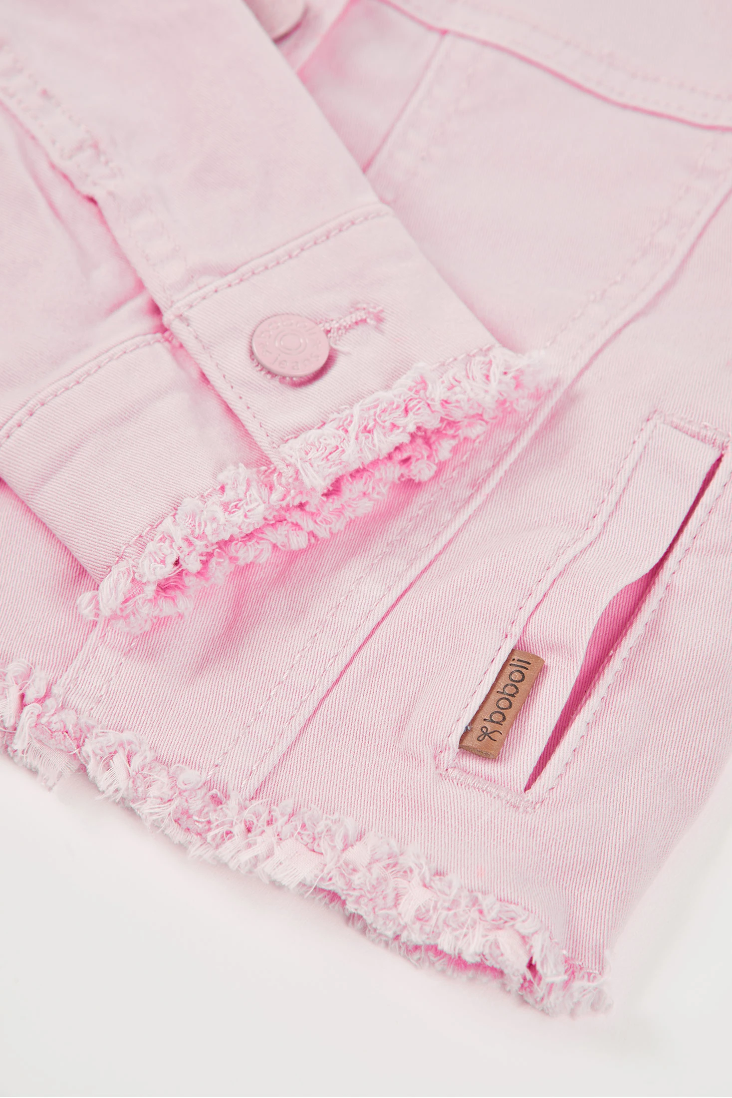 Pink denim jacket for girls, perfect for adding a touch of colour to any outfit. Made from durable fabric, it offers comfort and style. Its design includes a button closure and frayed details that give it a modern flair. Suitable for ages from 12 months to 14 years, this garment is perfect for casual occasions or happy days out. It can be easily paired with jeans or skirts for a casual and trendy look.