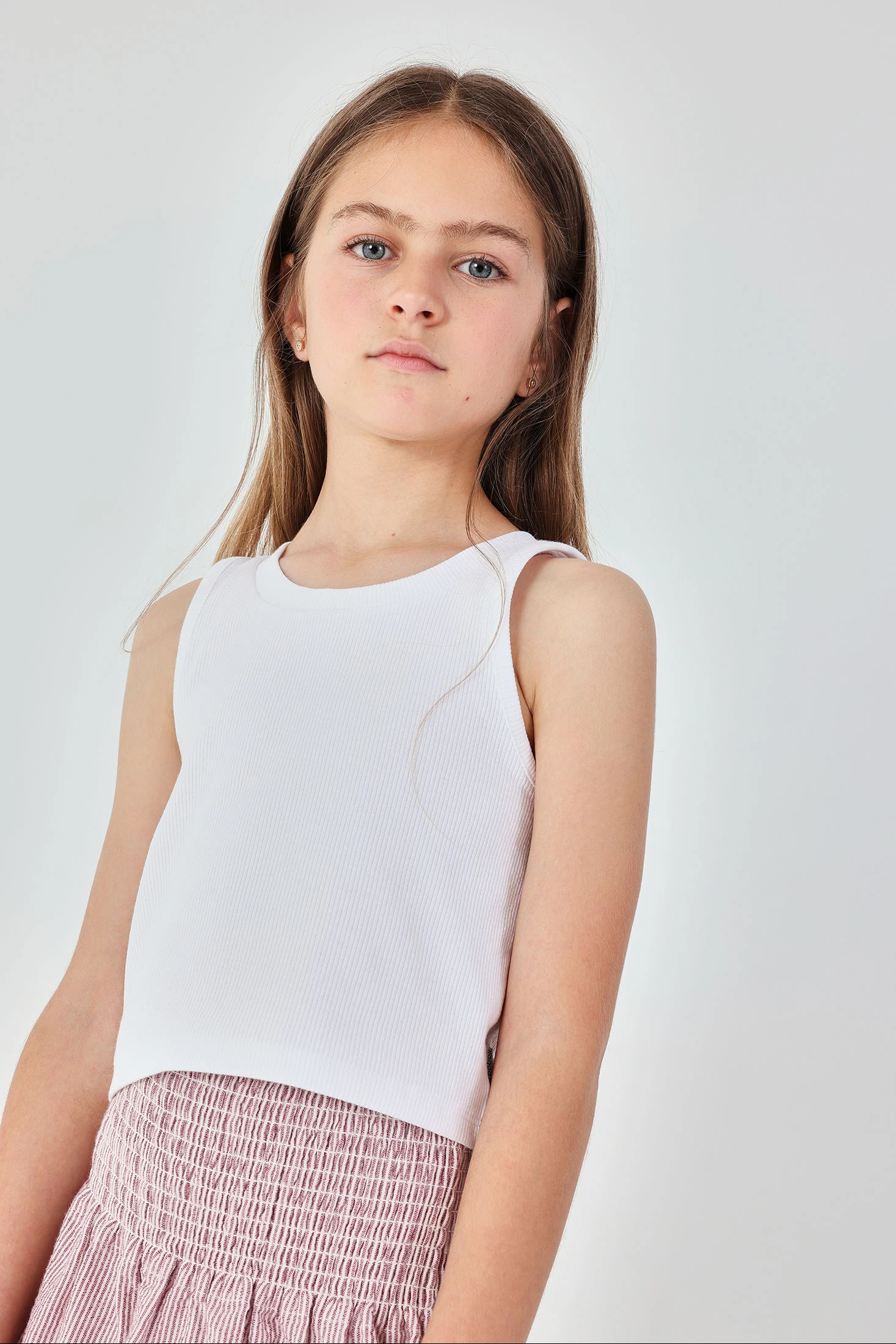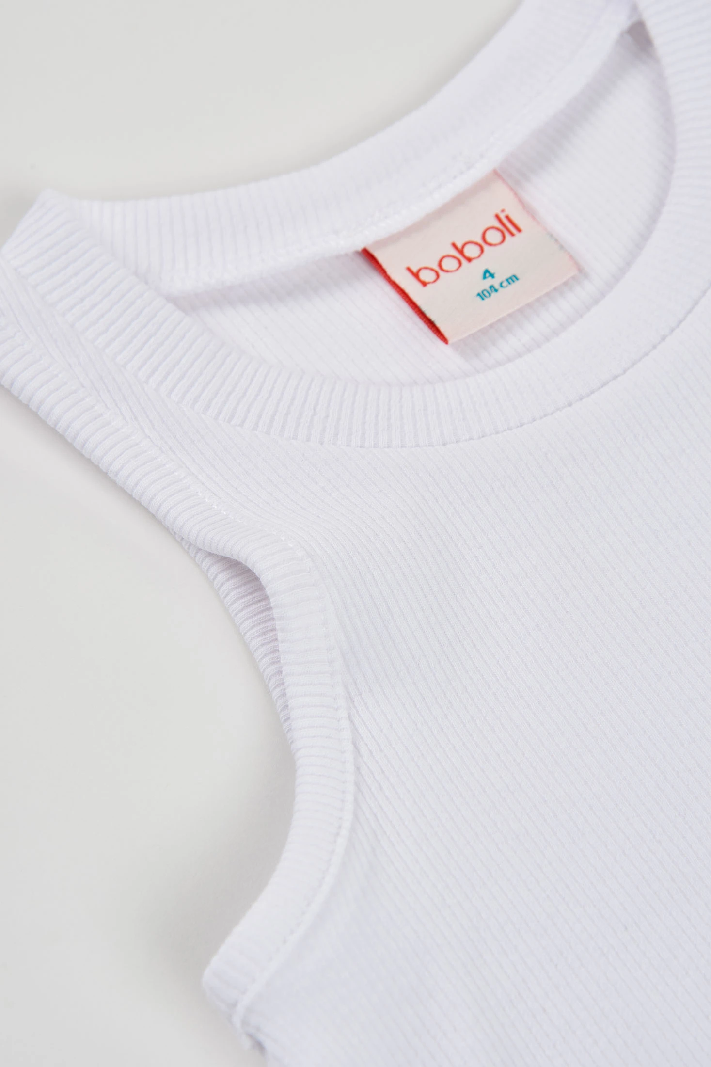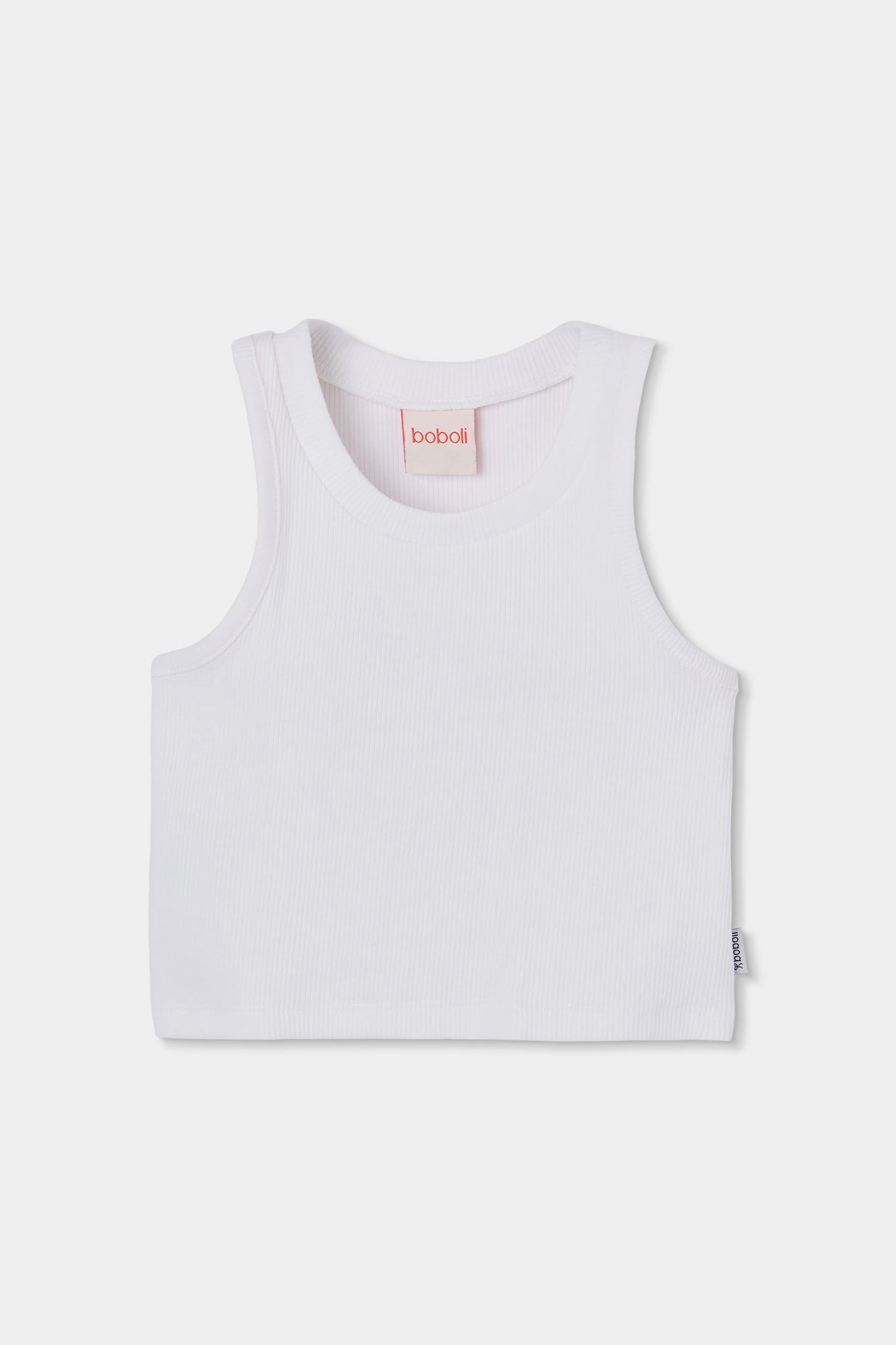 White sleeveless top, ideal for girls in the summer season. Its simple and elegant design suits any occasion. Made of ribbed knit fabric, it offers comfort and freshness on warm days. Sizes available for ages from 12 months to 12 years, making this piece a versatile option that can be easily paired with other garments. The classic style makes it an essential addition to any child's wardrobe.