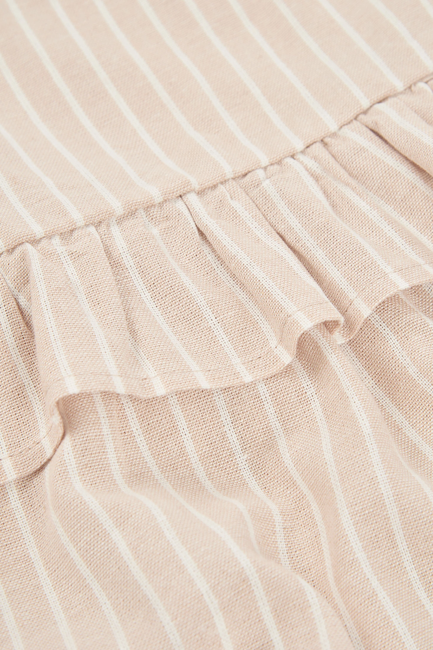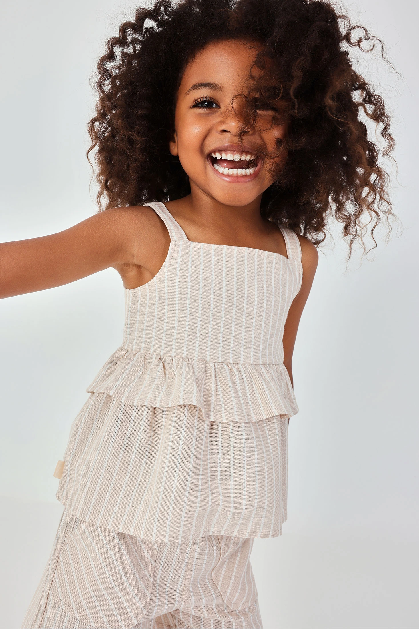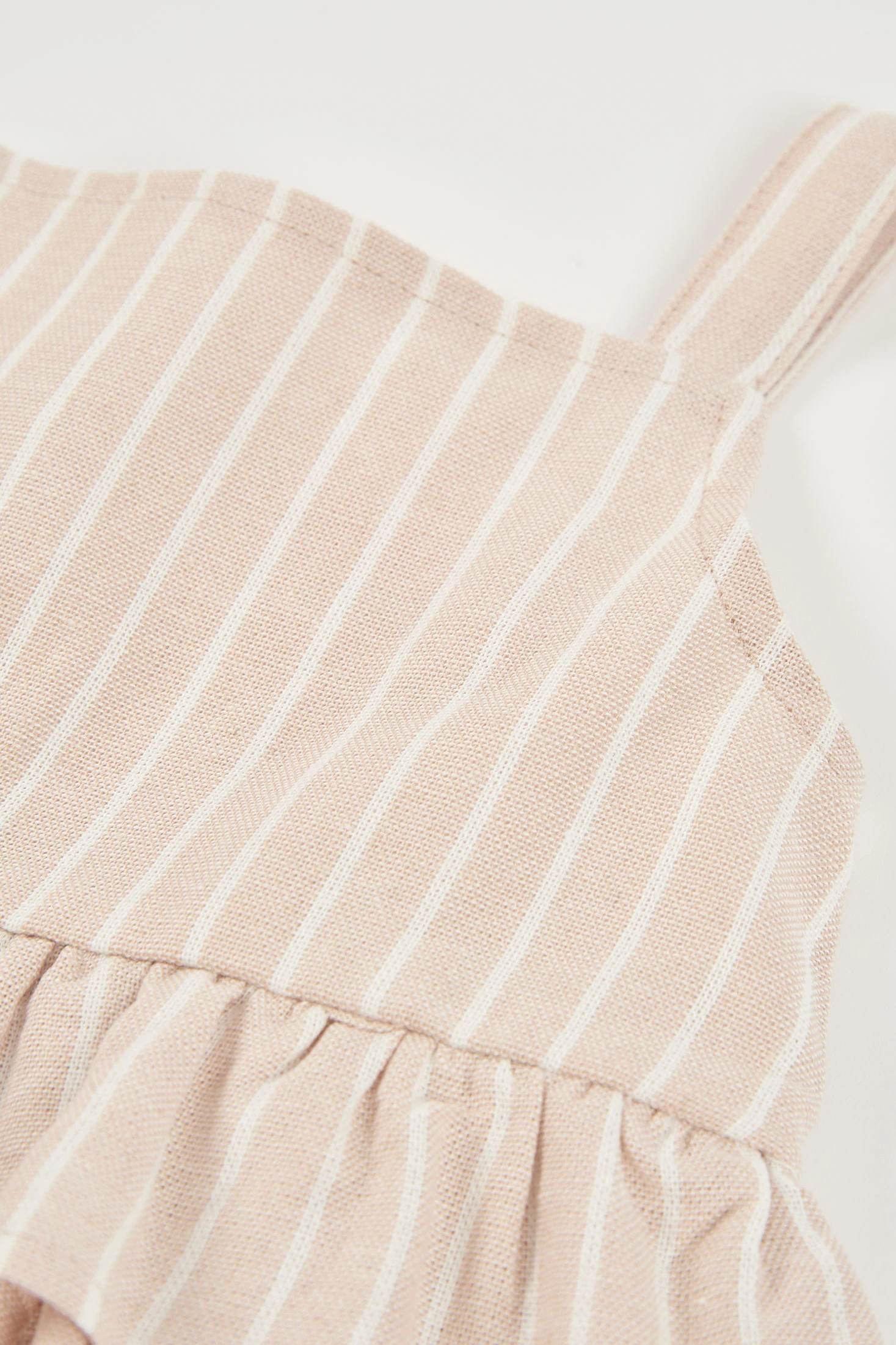 Striped linen top for girls, ideal for the summer months, thanks to its lightweight and breathable fabric. The design features wide straps and a frill at the bottom, adding a charming touch. The beige colour with white vertical stripes makes it a versatile and elegant piece. Available in sizes from 12 months to 10 years, it suits different ages and growth stages. Perfect for pairing with skirts or lightweight trousers, it offers a fresh and modern look for any casual occasion.