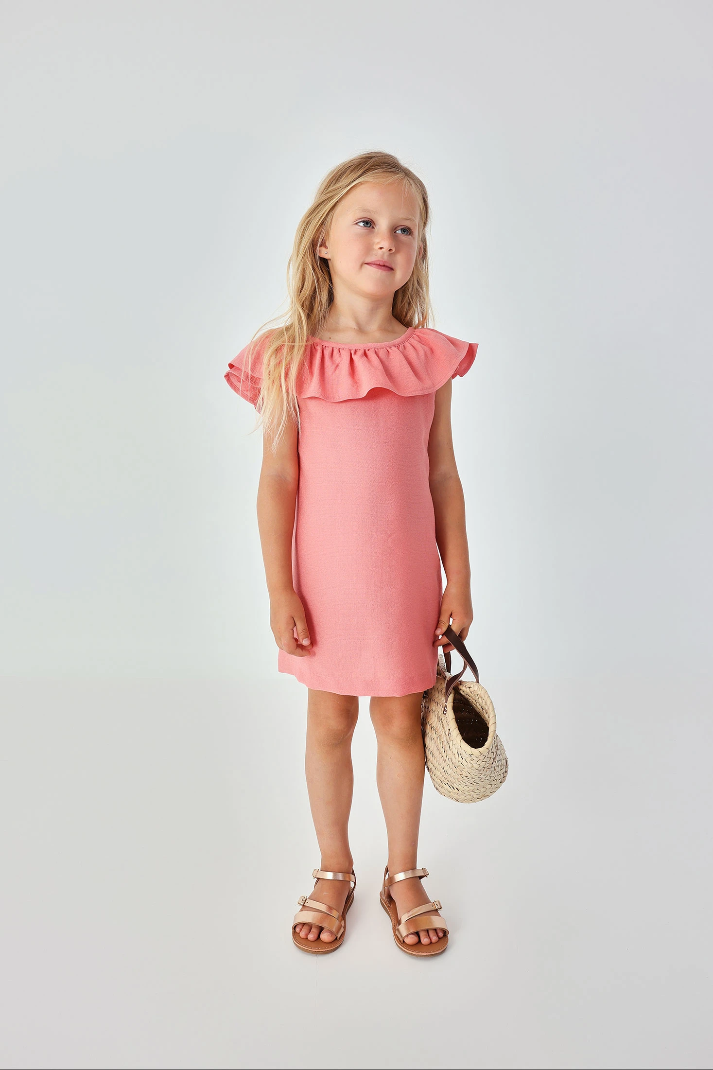 Charming fantasy fabric dress in pink, ideal for girls, offering a fresh and light look. Its design features a ruffle on the neck, providing an elegant and feminine touch. Made from linen, it is perfect for the warm months, allowing breathability and comfort. Available in sizes from 12 months to 10 years, it is designed to adapt to different stages of growth. Its soft pink colour makes it versatile, ideal for pairing with simple accessories, perfect for special occasions or everyday wear.