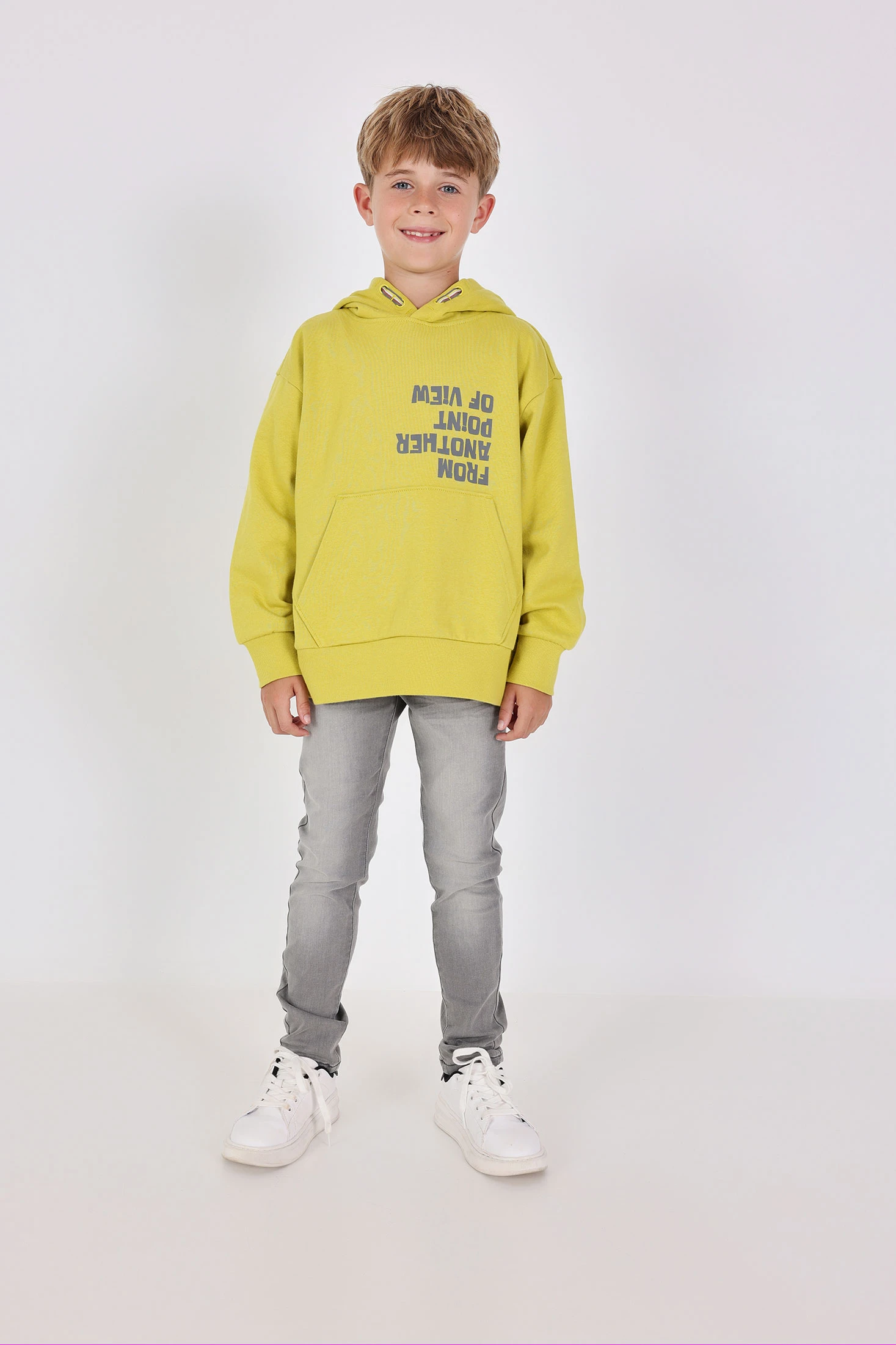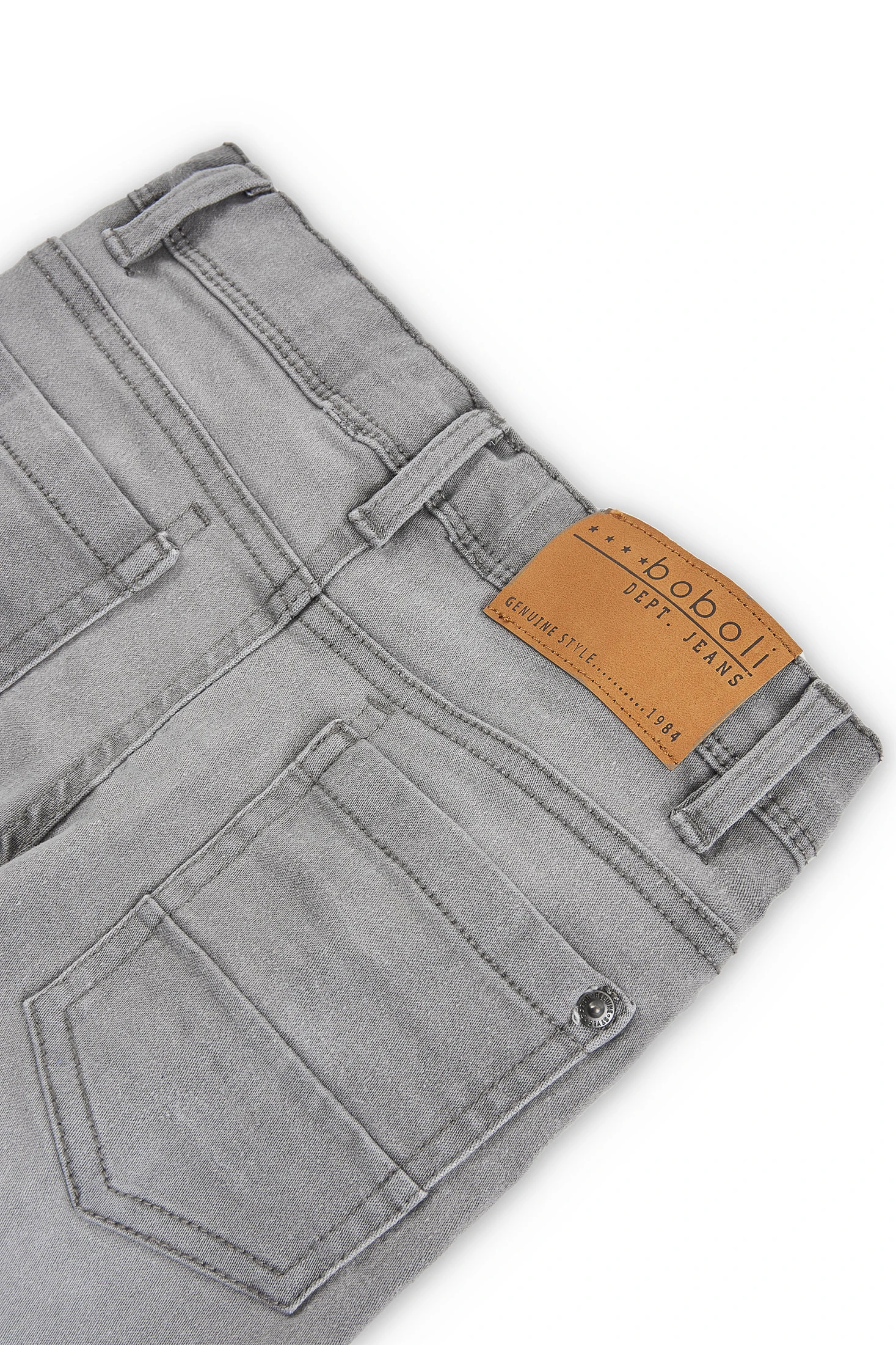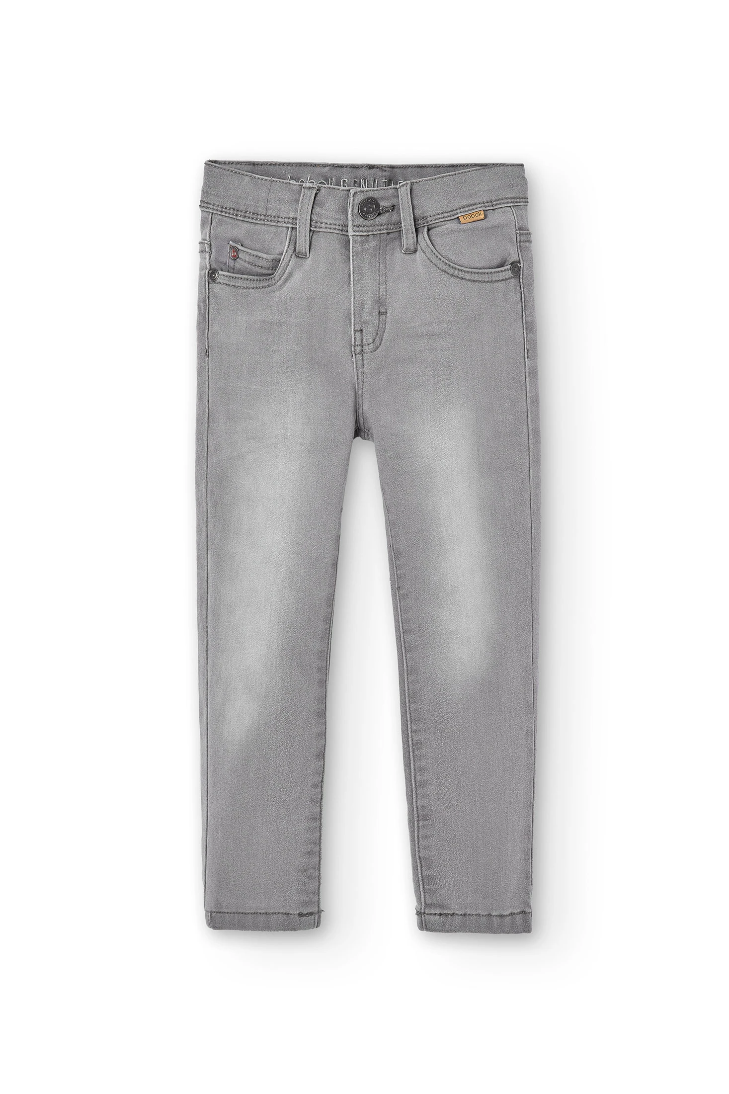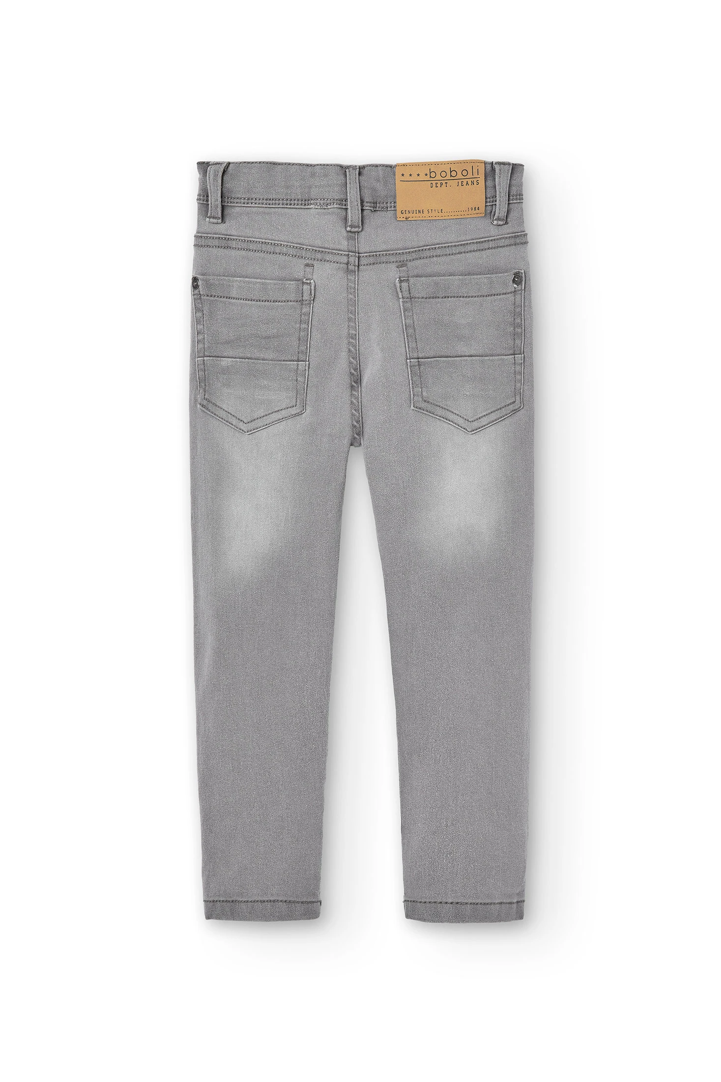 This is a stretchy denim trouser for boys, available in sizes ranging from 4 months to 16 years. It's a plain, grey piece, perfect for in-between seasons. The fabric is flat, offering comfort and durability. The trousers are easy to put on and take off, thanks to the button closure. Ideal for everyday wear, these trousers provide a balance of style and practicality. They are versatile and can be paired with various tops to create different looks. A must-have in every boy's wardrobe.