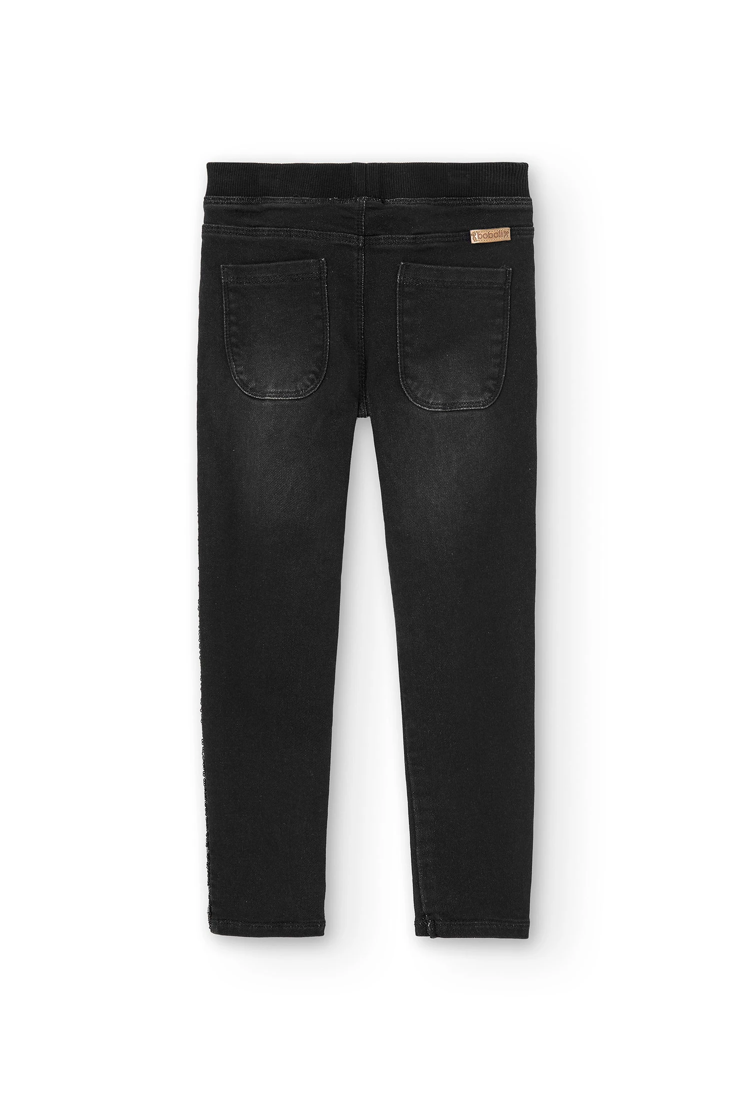 This is a girl's stretch denim trouser, perfect for in-between seasons. It's made from a knit fabric, providing comfort and flexibility for active children. The trousers come in a deep black colour, versatile for any outfit. They feature a stylish print, adding a fun touch to the design. Available in sizes ranging from 4 months to 16 years, these trousers can accompany your child as they grow. The stretch denim trousers are a practical and fashionable choice for your child's wardrobe.