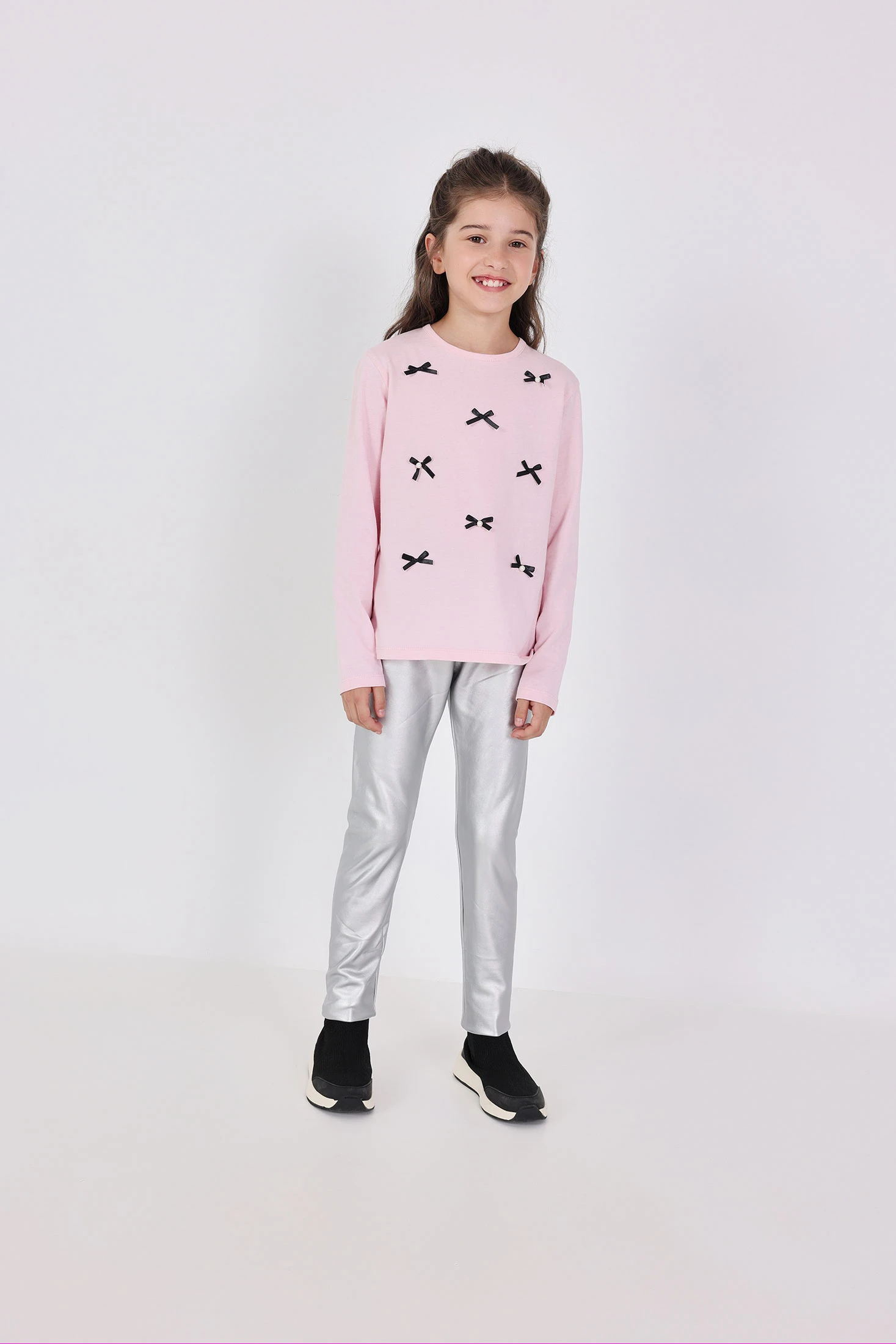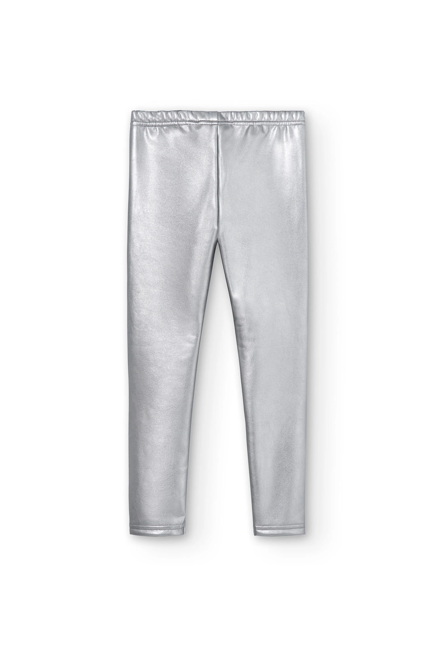 Girls' silver faux leather leggings with elastic. They feature a small print with brand detailing. Available from sizes 4 to 16 years.