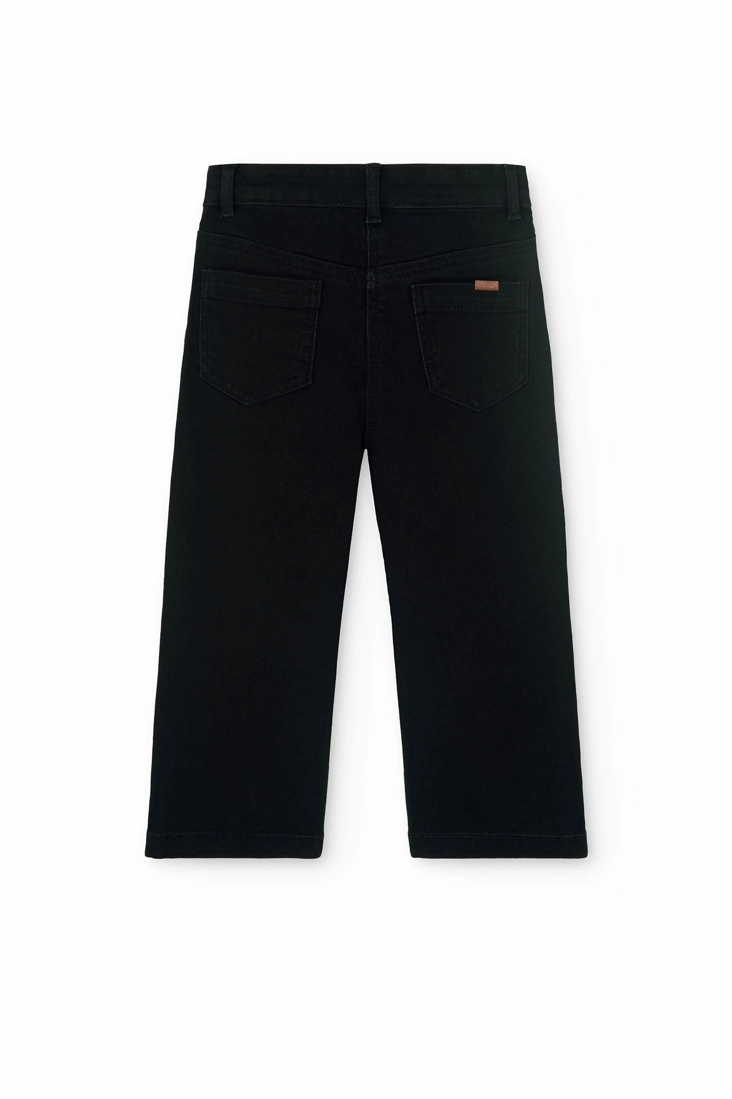 This is a plain, black, stretch denim trouser for girls. It's available in sizes ranging from 4 months to 16 years. The fabric is flat, making it comfortable for everyday wear. It's perfect for in-between seasons, ensuring your child stays stylish all year round. The trousers are easy to put on and take off, thanks to the button closure. This versatile piece can be paired with any top, making it a must-have in your child's wardrobe. Please note, this product does not include any brand names or promotions.