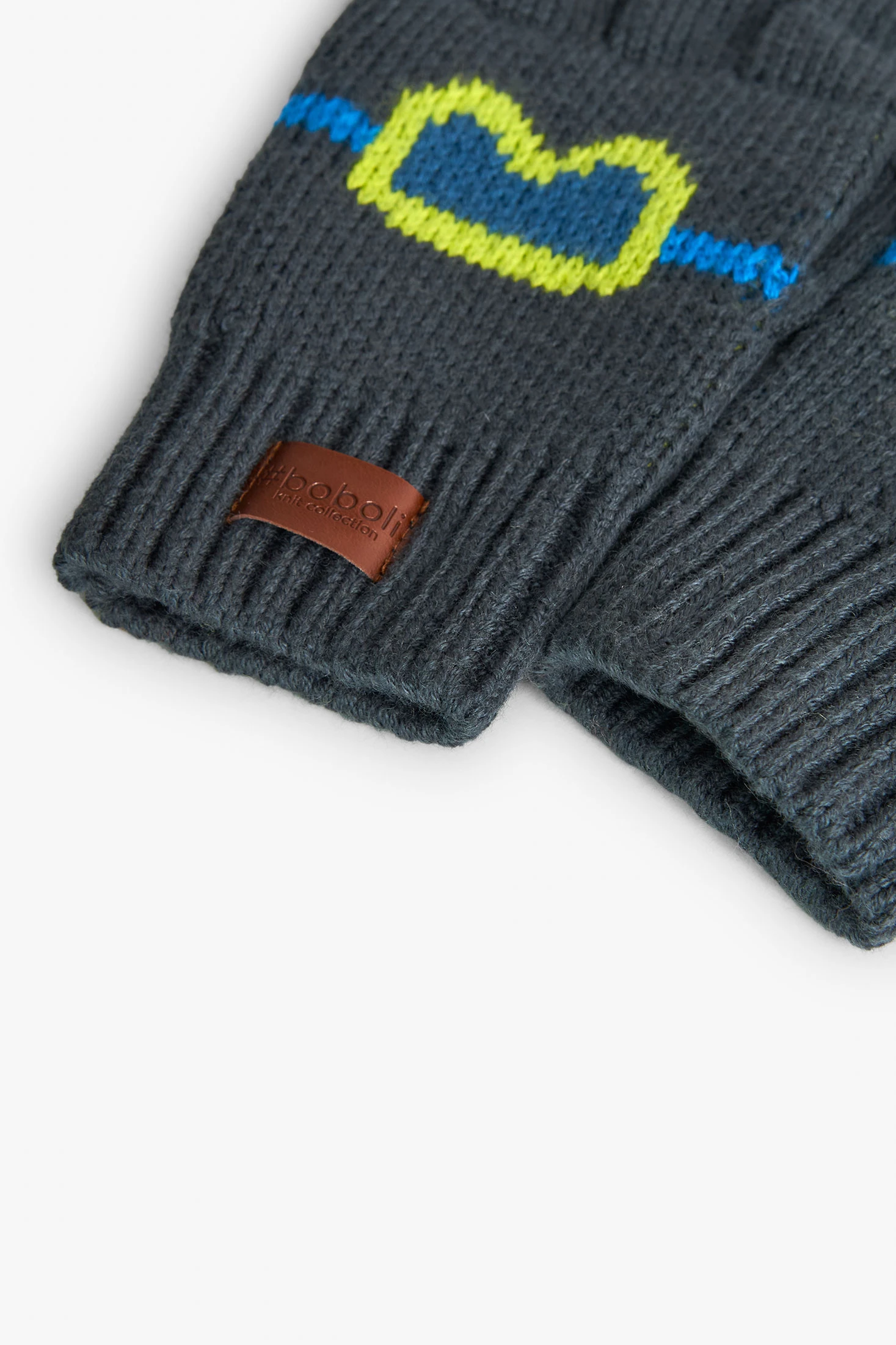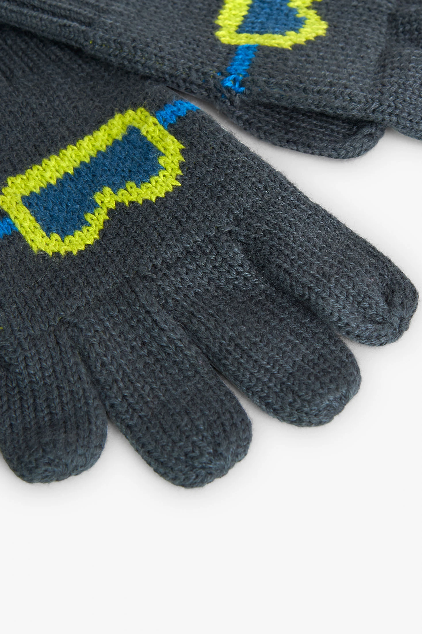 This is a pair of knitted gloves for boys, available in sizes M, L, XL, and XXL. They are made of knitted fabric, making them warm and comfortable, perfect for winter. The decoration is a fun print of glasses, adding a touch of joy to the garment. The colour is a dark grey, versatile and easy to match with other clothes. These gloves are a practical and attractive option to keep little hands warm during the colder months.