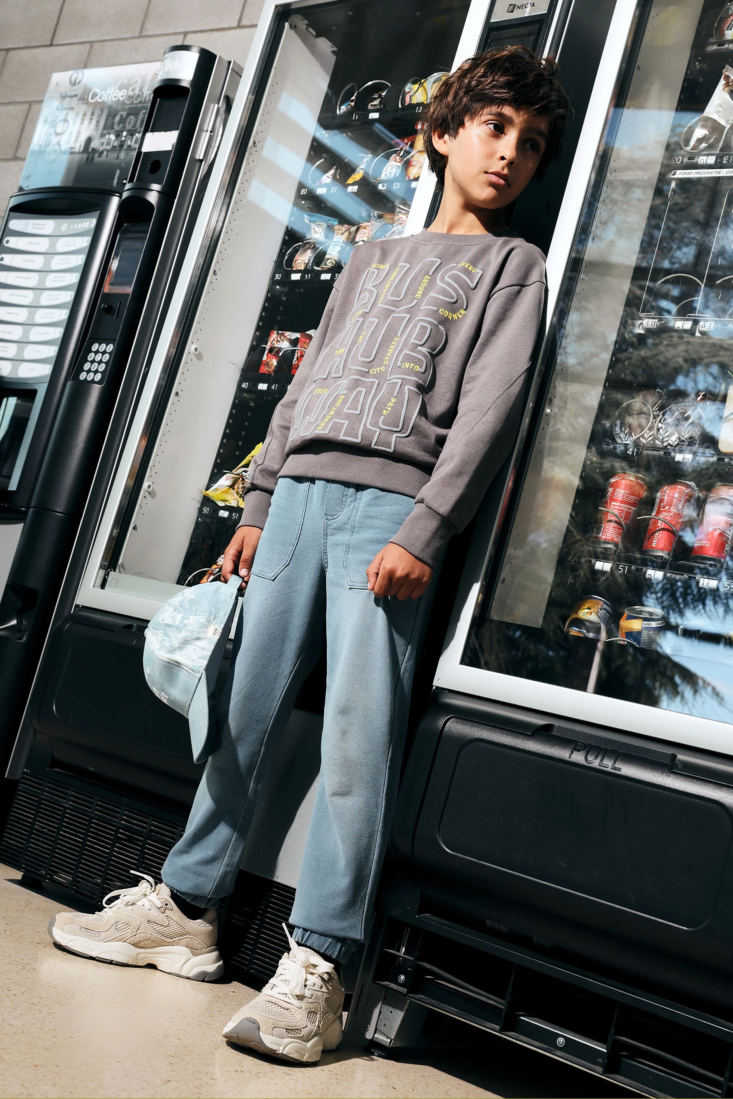 This is a pair of boys' denim fleece trousers in bleach colour, ideal for the in-between seasons. Its knitted fabric gives it a soft and comfortable texture, perfect for a child's delicate skin. The garment is in BLEACH Blue, a colour that brings a touch of freshness and joy. The design is plain, without decorations, which makes it easy to combine with any other garment. Available sizes range from 4 years to 16 years, covering a wide stage of childhood. A practical and versatile pair of trousers for your little one's everyday life. Translated with DeepL.com (free version)