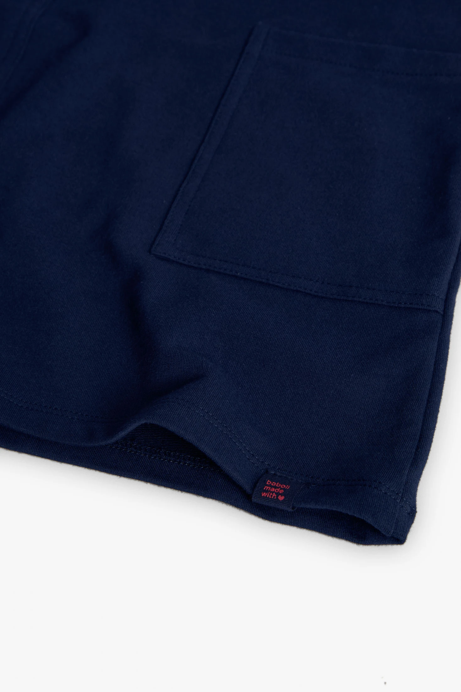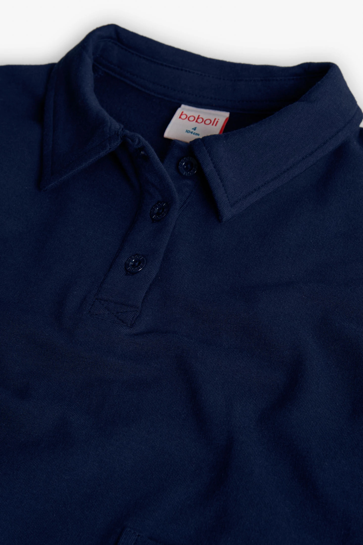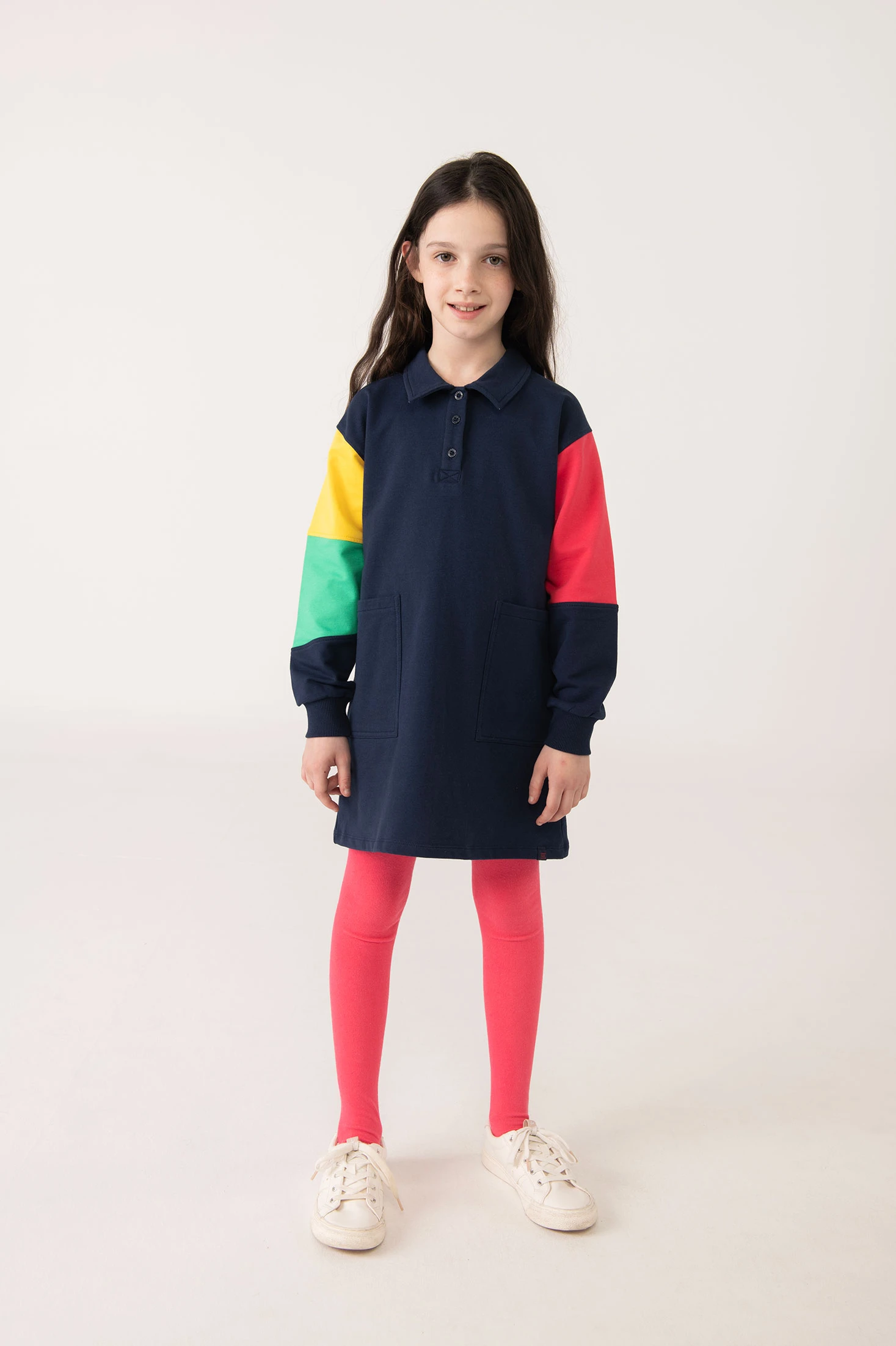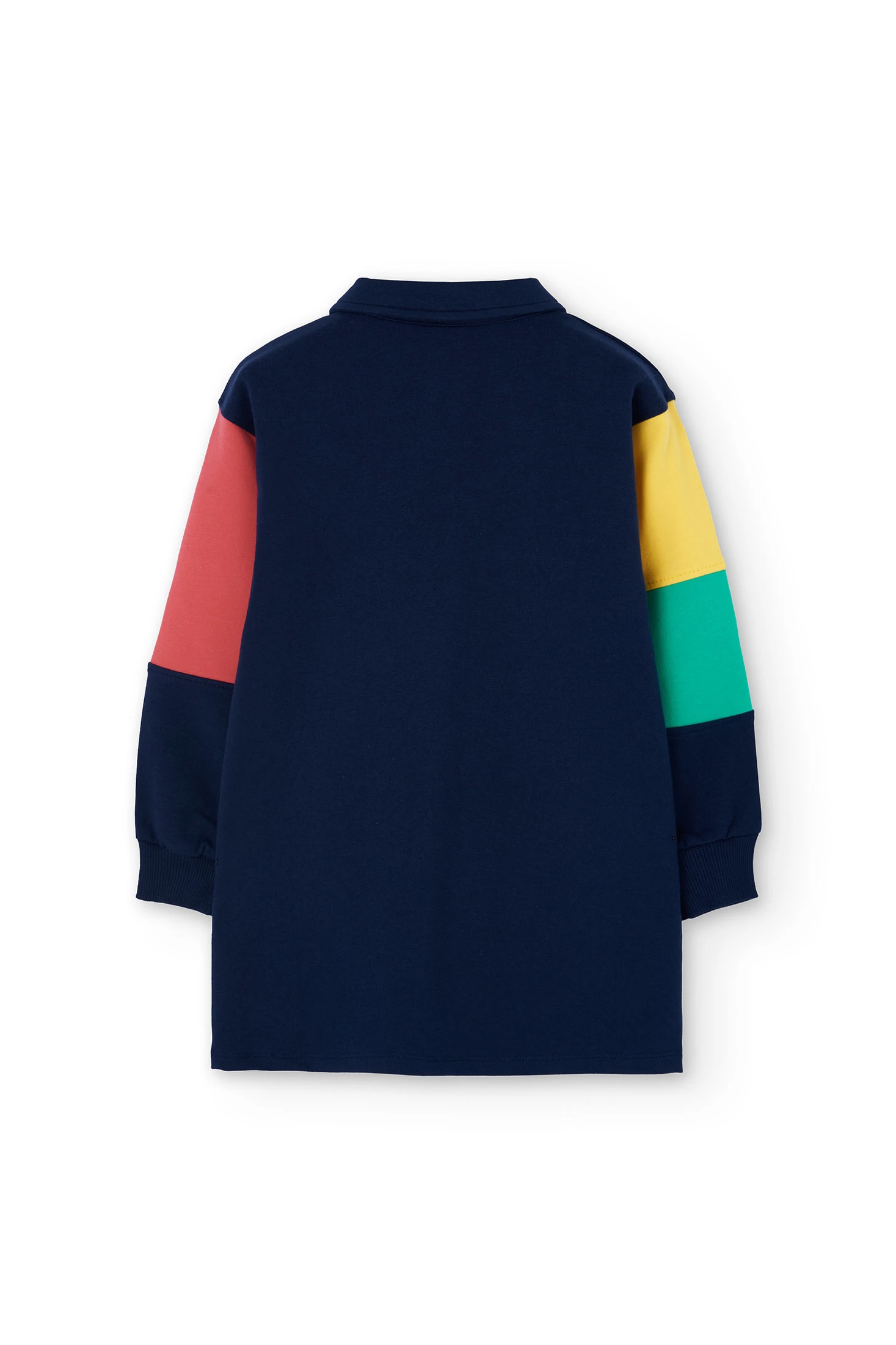 Sweatshirt-style dress for girls, perfect for the autumn and winter seasons, crafted from soft fleece fabric that provides great comfort and warmth. It features an elegant navy blue colour combined with vibrant colour bands on the sleeves: yellow, green, and red, adding a cheerful touch. Designed with a practical polo-style collar with buttons and front pockets that add functionality. The long sleeves make it an ideal choice for cooler days. Available in sizes from 2 to 14 years, this versatile dress suits any casual occasion and pairs easily with leggings or tights.