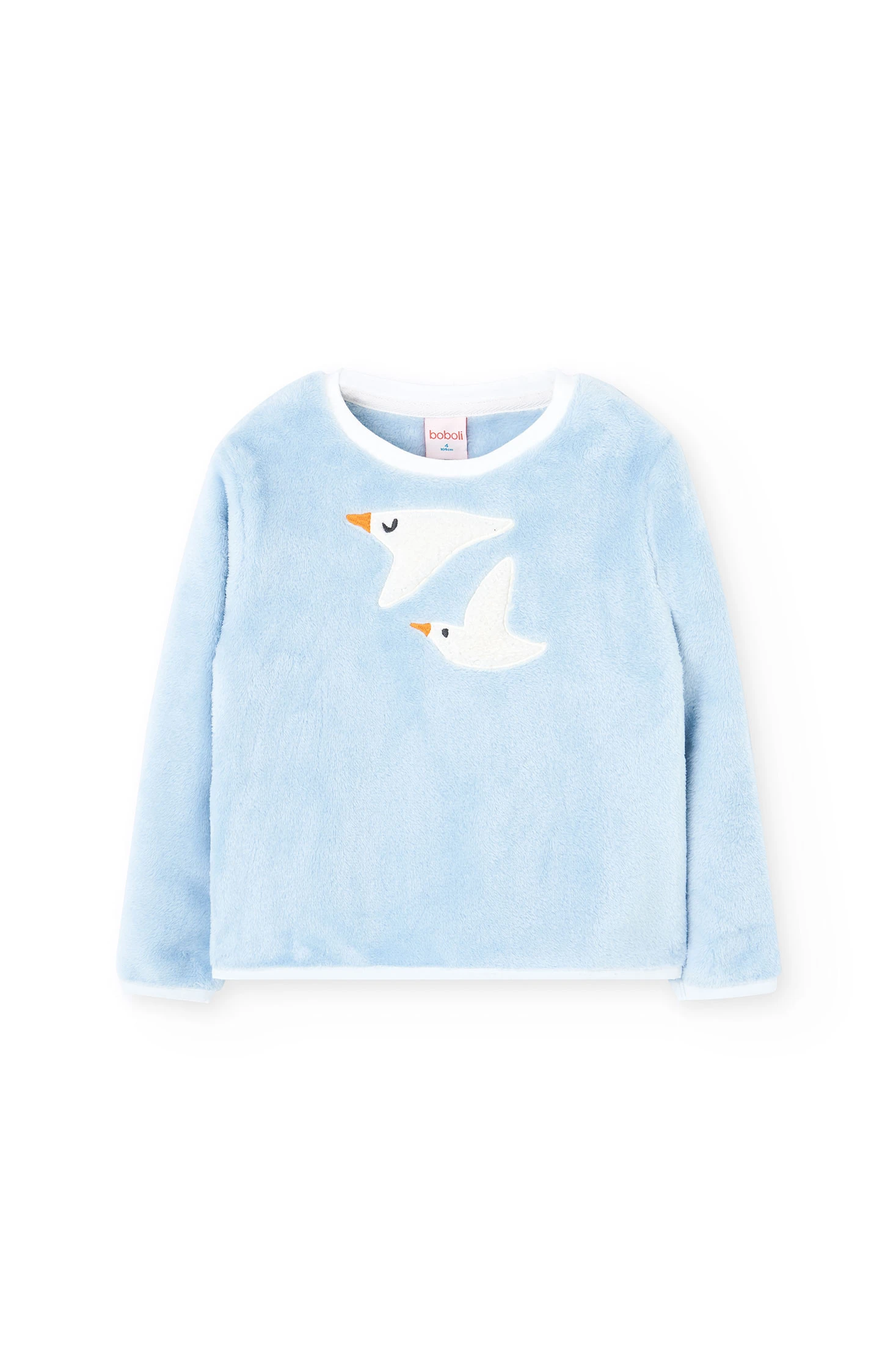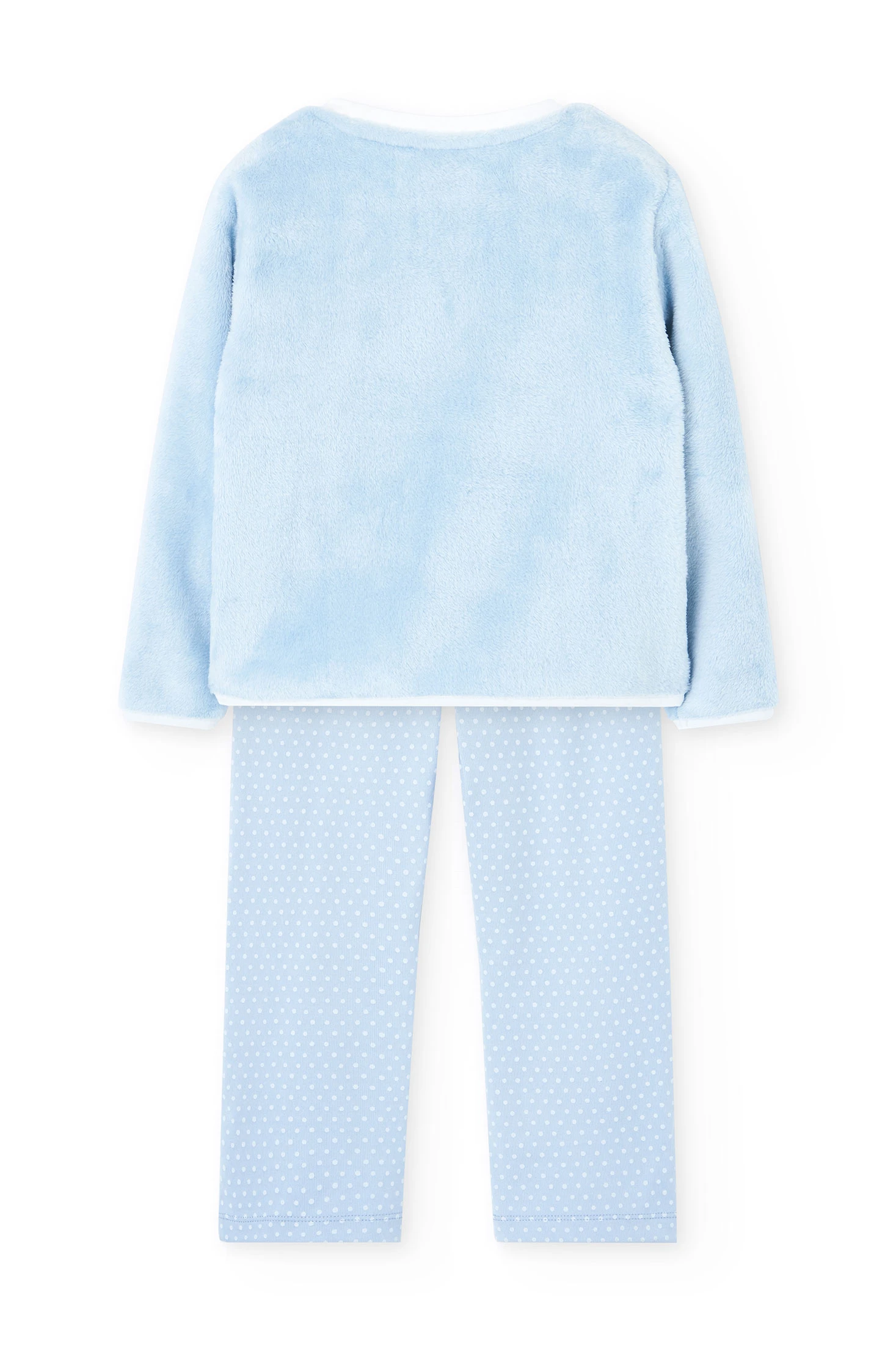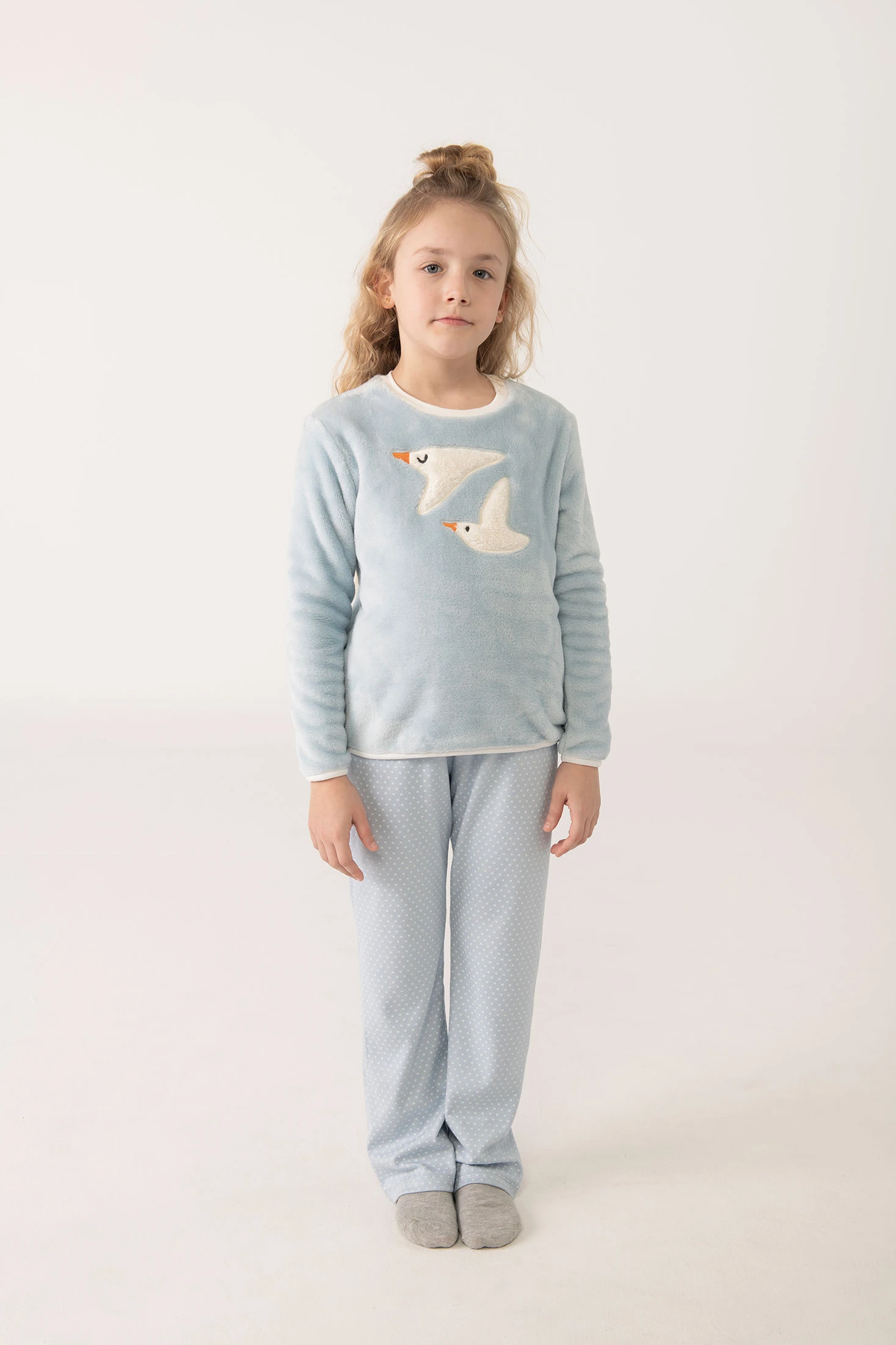 Blue velvet pyjamas with a seagull design, perfect for keeping children comfortable and warm during the autumn and winter seasons. Its high-quality soft material provides exceptional thermal comfort for cold nights. With a charming bird print in light blue, the top will capture the attention of the little ones. The trousers, featuring a white polka dot design on a blue background, add a cheerful and modern touch to the ensemble. Available in sizes from 2 to 14 years, this option is practical and stylish for children's wardrobes.