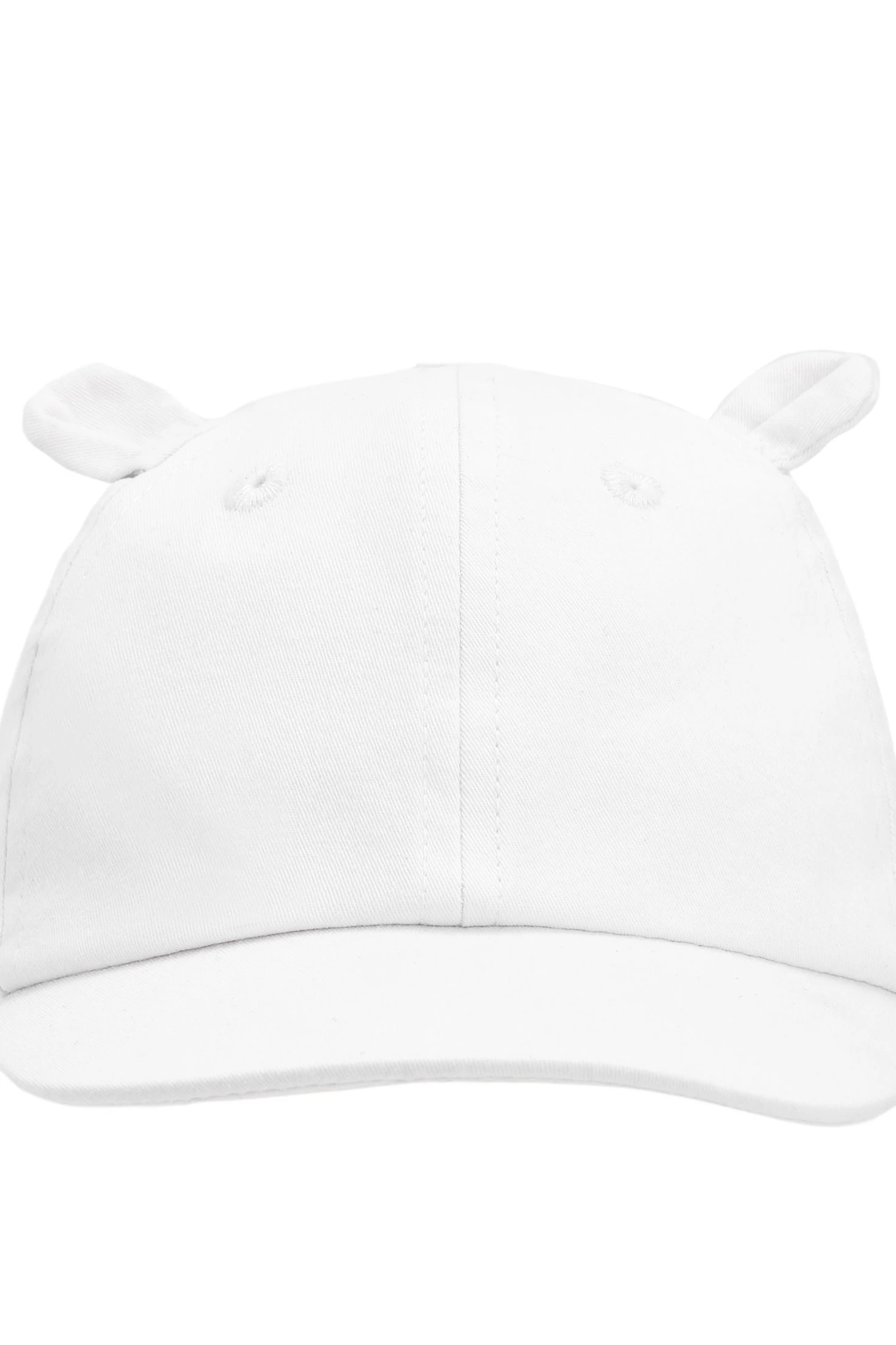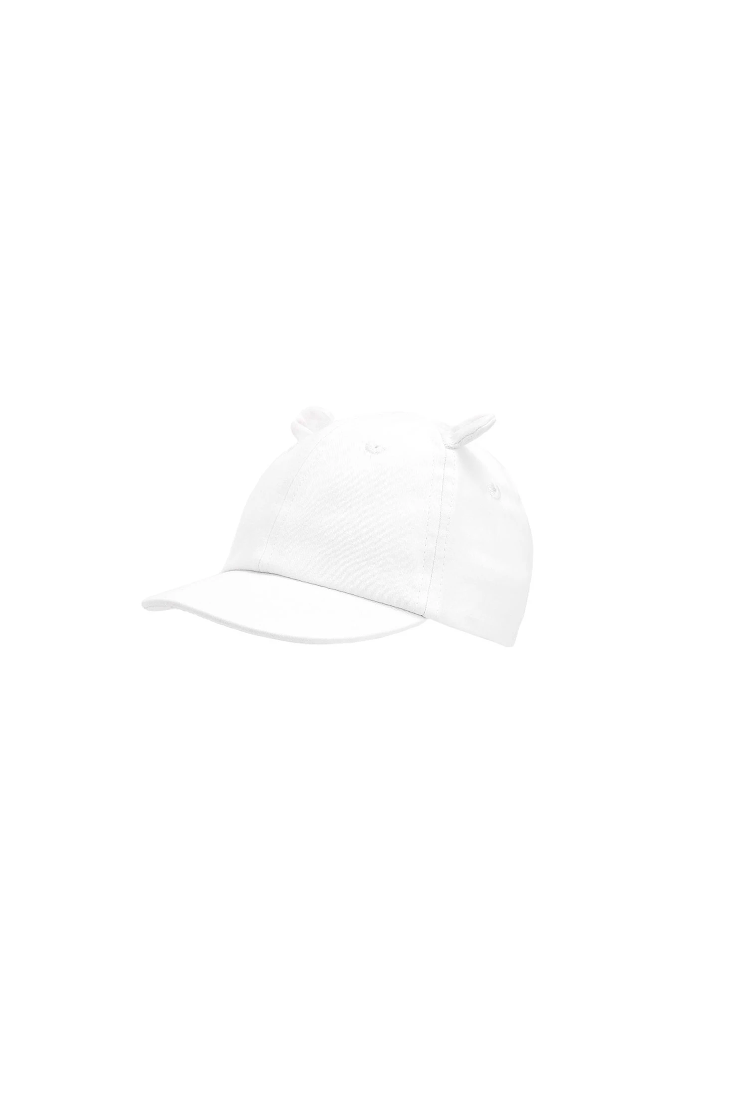 This is a baby's cap, suitable for newborns, both boys and girls. It's made of flat fabric, plain in design, and comes in a pure white colour. The cap features cute little ears, adding a playful touch. It's available in various sizes, from XXS42 to M/50, catering to babies from a few months old to a few years. This cap is perfect for the summer season, providing shade and protection from the sun. It's a simple yet stylish piece of clothing that will keep your baby comfortable and cool during the warm months.