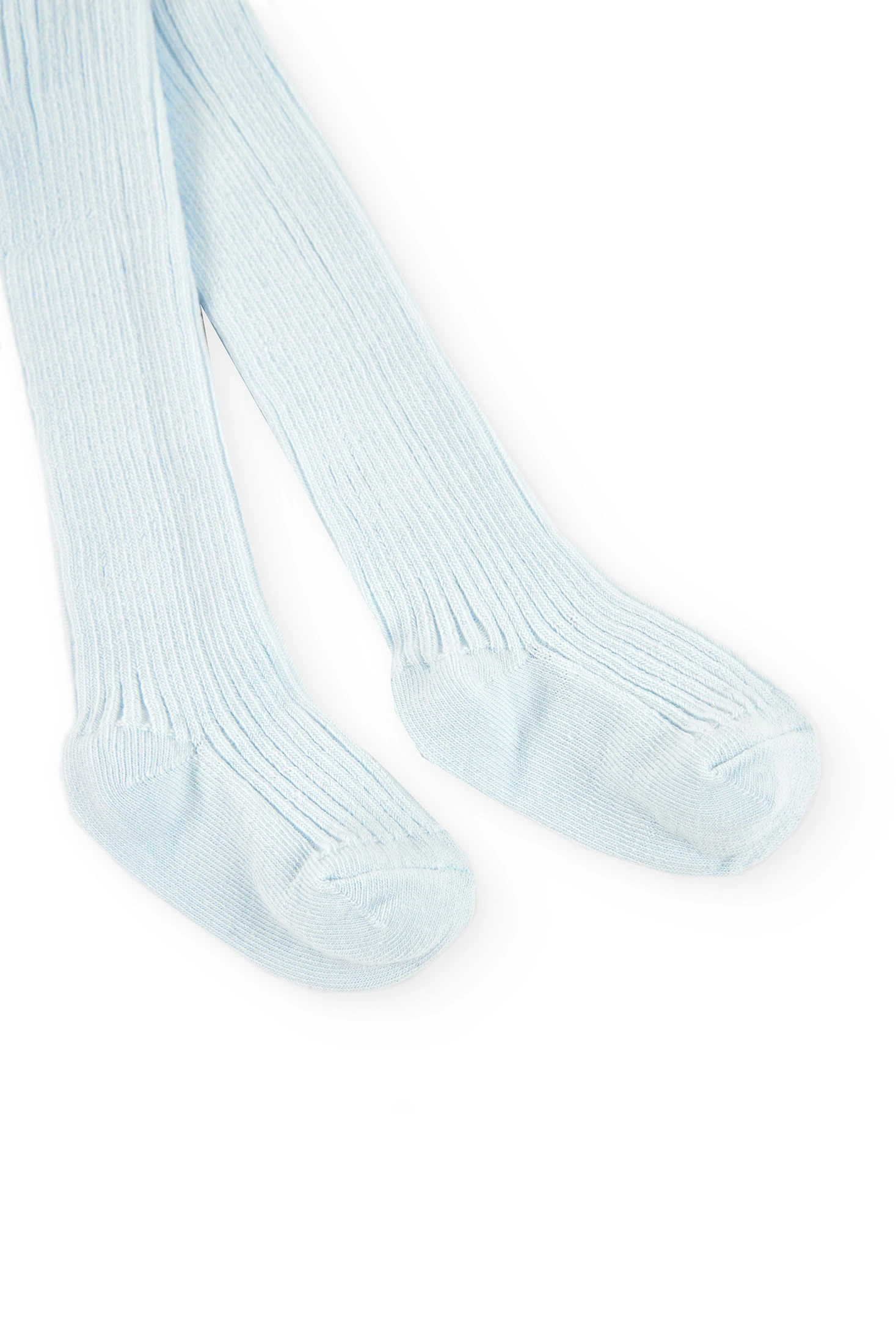 Baby girls' basic leotard in light blue ribbed fabric with an elastic waistband. Available from size 0 months to 2 years.